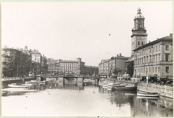 Stora Hamnkanalen sedd från Brunnsparken med Tyska kyrkan m.m. i bakgrunden.