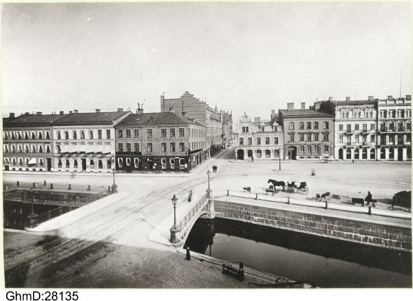 Utsikt från hotell Göta Källare (Hotellplatsen) mot Drottningtorgets västra del med närliggande omgivning: t.v. Norra Hamngatan; där den slutar går Nils Ericsonsgatan fram. I förgrunden Kvarnbron.
