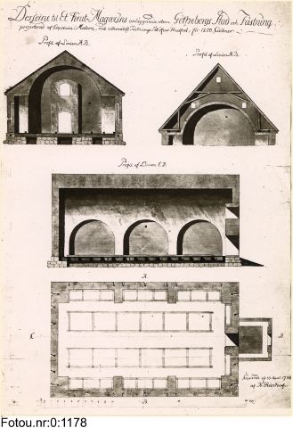 Plan och profil till ett krutmagasin för 1200 centner krut utom fästningen med alternativt täckningssätt över valvet, upprättad av kaptenen vid Fortifikationen J.A. von Matérn och kopierad av konduktören J.N. Stéenhof år 1788.