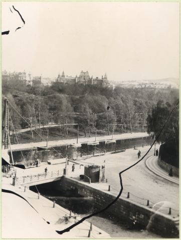 Utsikt mot sydväst från fastigheten Västra Hamngatan 26 (hörnet av Grönsakstorget) år 1904 (anm. våren s.å.). Fyllning av Västra Hamnkanalen pågår. Man lägger märke till Sahlgrensbron i förgrunden, Vallgraven och Kungsparken samt bakom den sistnämnda fastigheter vid Parkgatan ( mitt i fonden K.F.U.M:s hus).