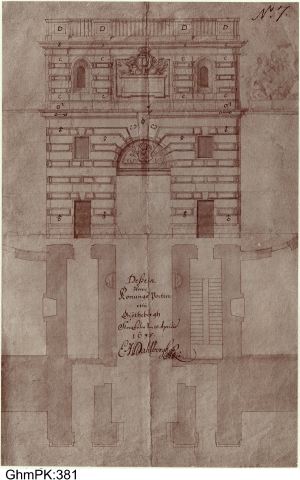 Kungsporten: ritning utförd 1695 till yttre sidan av porten jämte plan, upprättad av generalfälttygmästare Erik Dahlberg. Porten uppfördes vid slutet av 1600-talet och raserades 1836-1839. Vid portens uppförande frångick man denna ritning i vissa delar, huvudsakligen rörande portens övre del. I undervåningen voro inrymda vaktrum och arrestantkamrar m.m. Porten byggdes av generalkvartermästaren P.J. Leyonsparre.