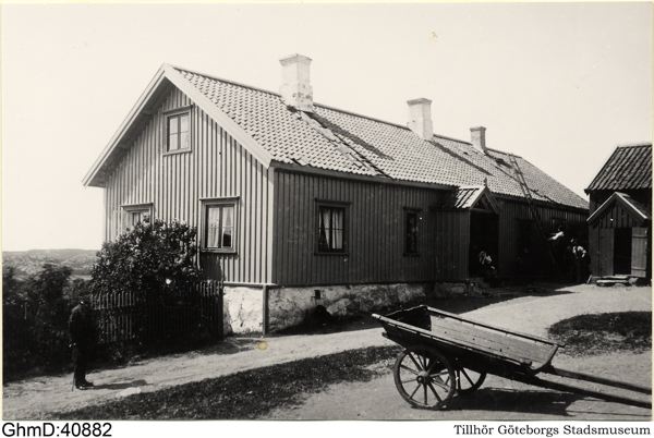 Sv/vitt foto av foto, 1978 i Fröken Ingegerd Klebergs ägo. Fotot visar prästgården från gårdsplanen. Byggnaden som skymtar till höger är arrendatorsbostaden. Arbete pågår med omläggning av takpannor. Mannen till vänster är Prebendevicepastor Klas Kleberg (f. 1850), på trappan sitter hans dotter Ingegerd (f. 1888) i knät på sin barnjungfru. Bild från omkring 1891-92 av Aron Jonason och ingick i en svit av bilder från Lundby nya och gamla kyrkor samt prästgården, med både exteriör- och interiörbilder. Familjen Kleberg flyttade från Lundby 1896 och därefter flyttades prästgården för att ge plats åt den nya.