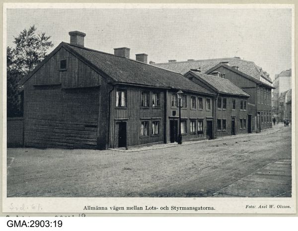Fr. v.1) 2 roten n:r 63 "Urmakare Söderströms" Revs när Lotsgatan lades ut.