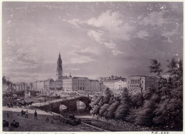 Gustaf Adolfs torg (f.d. Stora Torget). sett från Södra Hamngatan före 1854, då statyn restes. t.h. Brunnsparken, till 1861 en kringfluten holme.