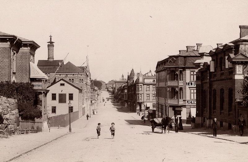 Sträckningsbild av Karl Johansgatan mot öster från trottoaren nedanför Karl Johanskyrkan. Nuvarande Nordgården, Karl Johansgatan 31 t.v. Längre ner t.v. Bryggeriet Kronan. T.h. Majornas småbarnsskola, Karl Johansgatan 50. På andra sidan Såggatan, Karl Johansgatan 48.