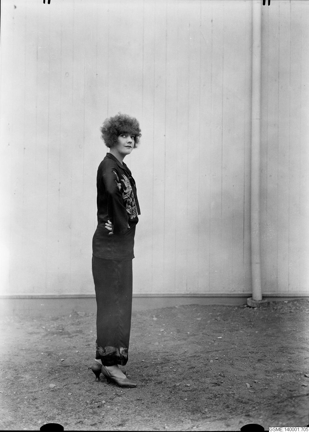 Photograph probably taken between 1927-29. Young woman in what most likely is a lounge pajama as she wears high heels and makeup and a pajama for sleeping generally was plainer and sometimes accessorized with night cap. Olsson & Hammarkvist fotografiatelier [a photography firm] unknown theatrical circumstances. gan 2020-04-29