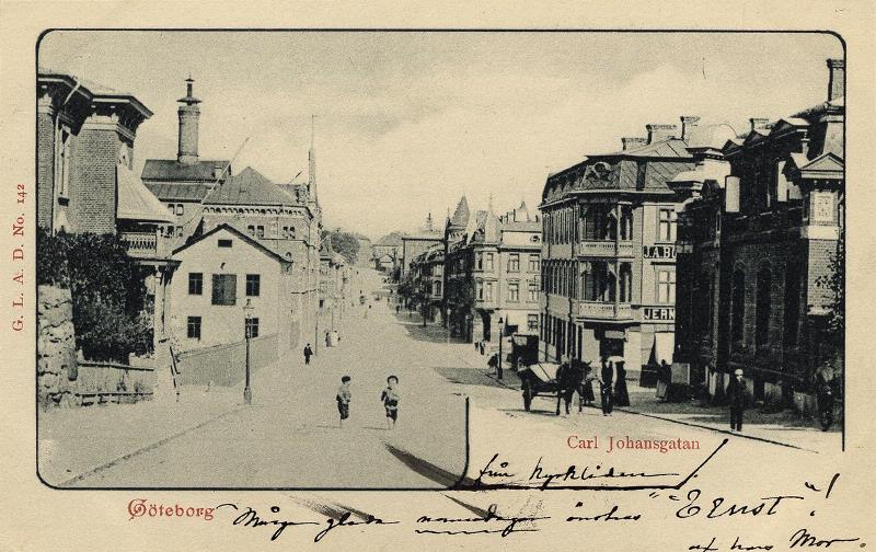 Sträckningsbild av Karl Johansgatan mot öster från trottoaren nedanför Karl Johanskyrkan. Nuvarande Nordgården, Karl Johansgatan 31 t.v. Längre ner t.v. Bryggeriet Kronan. T.h. Majornas småbarnsskola, Karl Johansgatan 50. På andra sidan Såggatan, Karl Johansgatan 48.