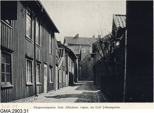 Chapmansgatan mot Gröna gatan. Gamla hus på båda sidor. Till höger utifrån inåt 1 roten n:r 128, 129,130, 131 resp. Chapmansgatan 1 B, 1C, 3 A, 3 B.