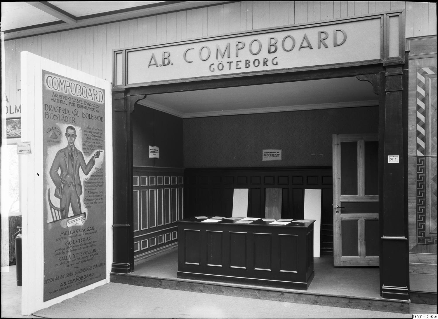 Väggytorna äro här i demonstrationssyfte dels obehandlade, dels tapetserade och dels oljemålade, under det taket är limstruket. Fyllningarna i dörren äro likaledes av Compoboard, och de torka ej ihop eller spricka sönder.