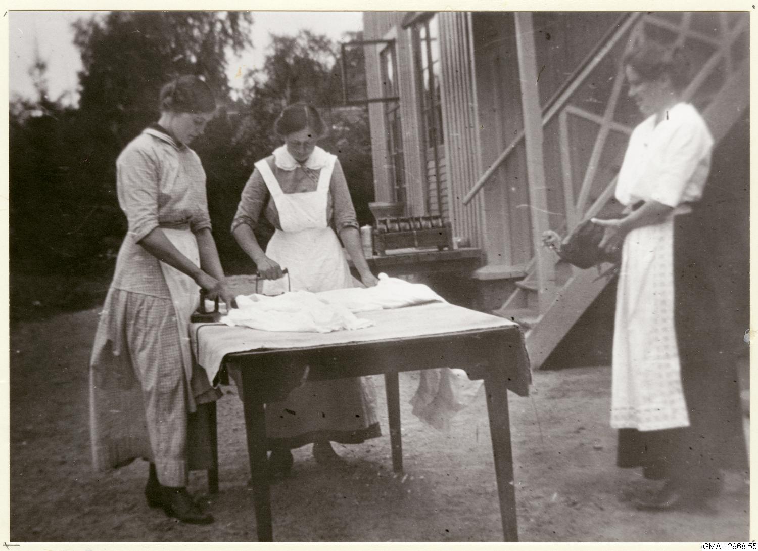 Ekwalls barnjungfru och hembiträde stryker utanför mejeriet. Fru Ekwall (?) m. kalkon. Strykjärnen värmdes inne i köket på vedspisen. Gåva av Hans Falklind, Lerum 1984.