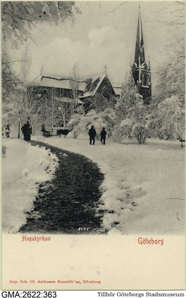 Hagakyrkan. Vykort med sv/v fotografi som förlaga.