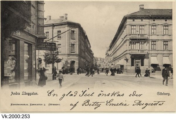 Andra Långgatan från Järntorget. Vykort, tryckt i en färg, med sv/v fotografi som förlaga.
