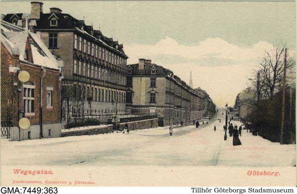Vegagatan, parti mot norr. Närmast till vänster nr 55, portvaktsbostaden till ålderdomshemmet vid Slottsskogen. Därefter på samma sida följer fastigheten nr 51-53 och därefter nr 49, 47, o.s.v. Vykort i färg med svartvitt fotografi som förlaga.
