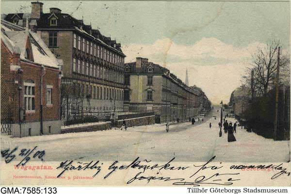 Vegagatan, parti mot norr. Närmast till vänster nr 55, portvaktsbostaden till ålderdomshemmet vid Slottsskogen. Därefter på samma sida följer fastigheten nr 51-53 och därefter nr 49, 47, o.s.v. Vykort i färg med svartvitt fotografi som förlaga.