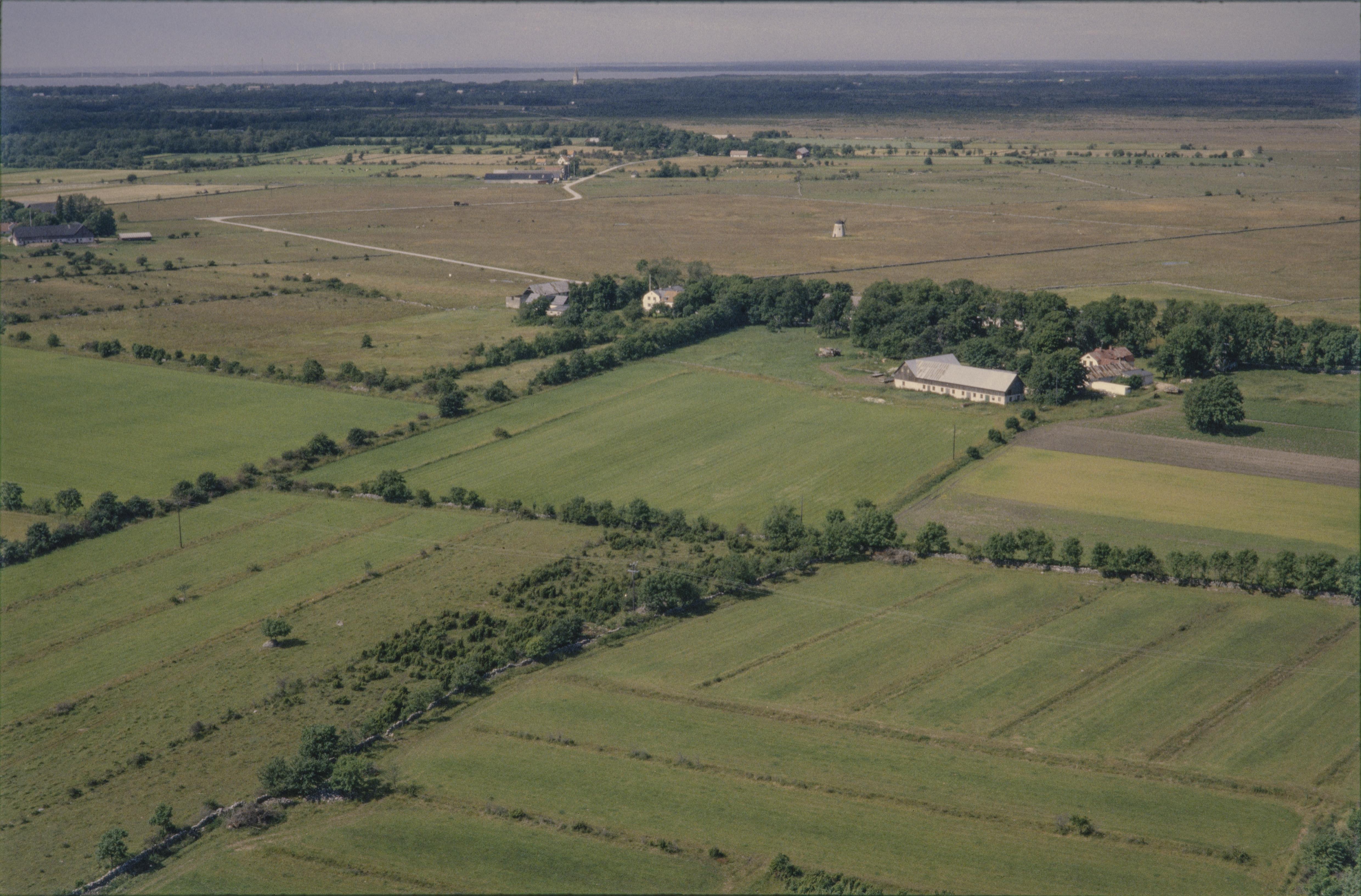 Beskrivning: Nordvästra området på näset Faludden. Till höger över bildens mitt Sigfride gård. Vid gården fyndplats (depåfynd) RAÄnr Öja 97:1. Gårdarna Burge och Barkarve till vänster i bildens övre del. Öja kyrka (och Fide kyrka ytterst till höger) i bildens övre kant. Bilden är tagen mot (väderstreck): NV