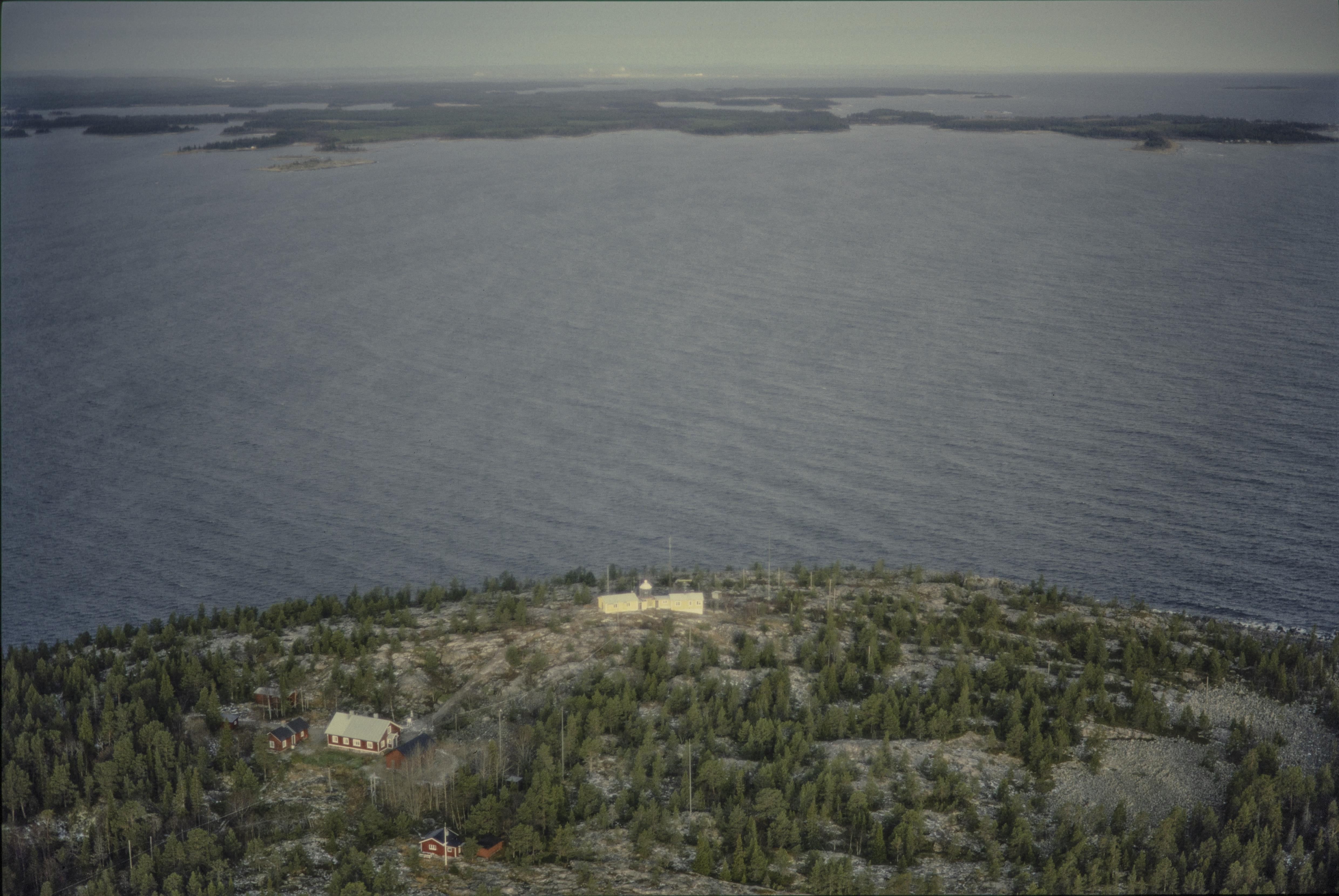 Beskrivning: Udden Bjuröklubb i Bjuröfjärden, norra delen. Bjuröklubbs fyrplats och lotsstation under bildens mitt. På udden fiskeläge RAÄnr Lövånger 487:1 m.fl, tomtning RAÄnr Lövånger 131:1 m.fl. I vattnet vid udden fartygslämning RAÄnr Lövånger 540 m.fl. m.m. Bilden är tagen mot (väderstreck): NV