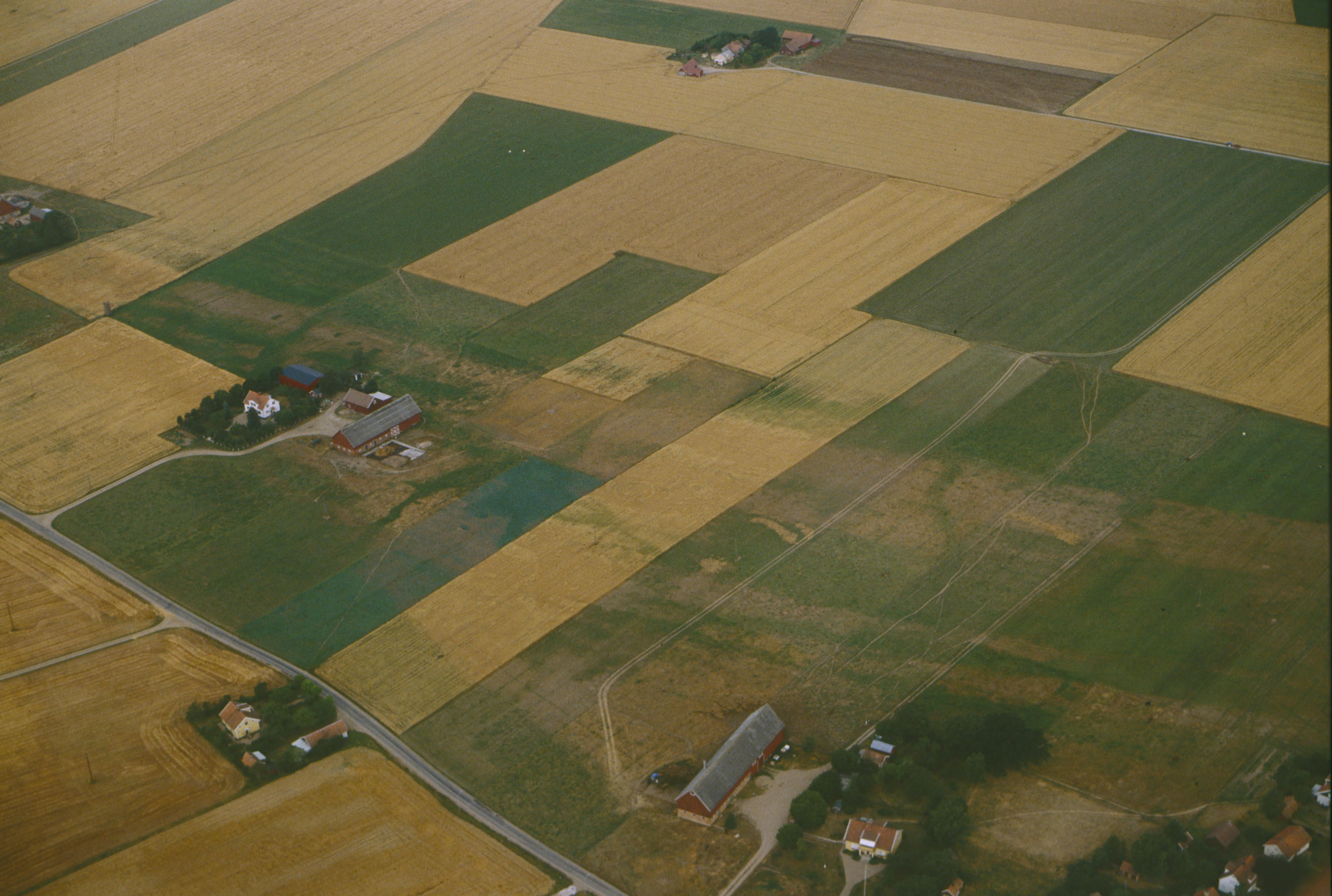 Beskrivning: Cropmarks i åker i västra delen av Längjum kykrby. Vid bildens mitt hög RAÄnr Längjum 63:1. Bilden är tagen mot (väderstreck): NV