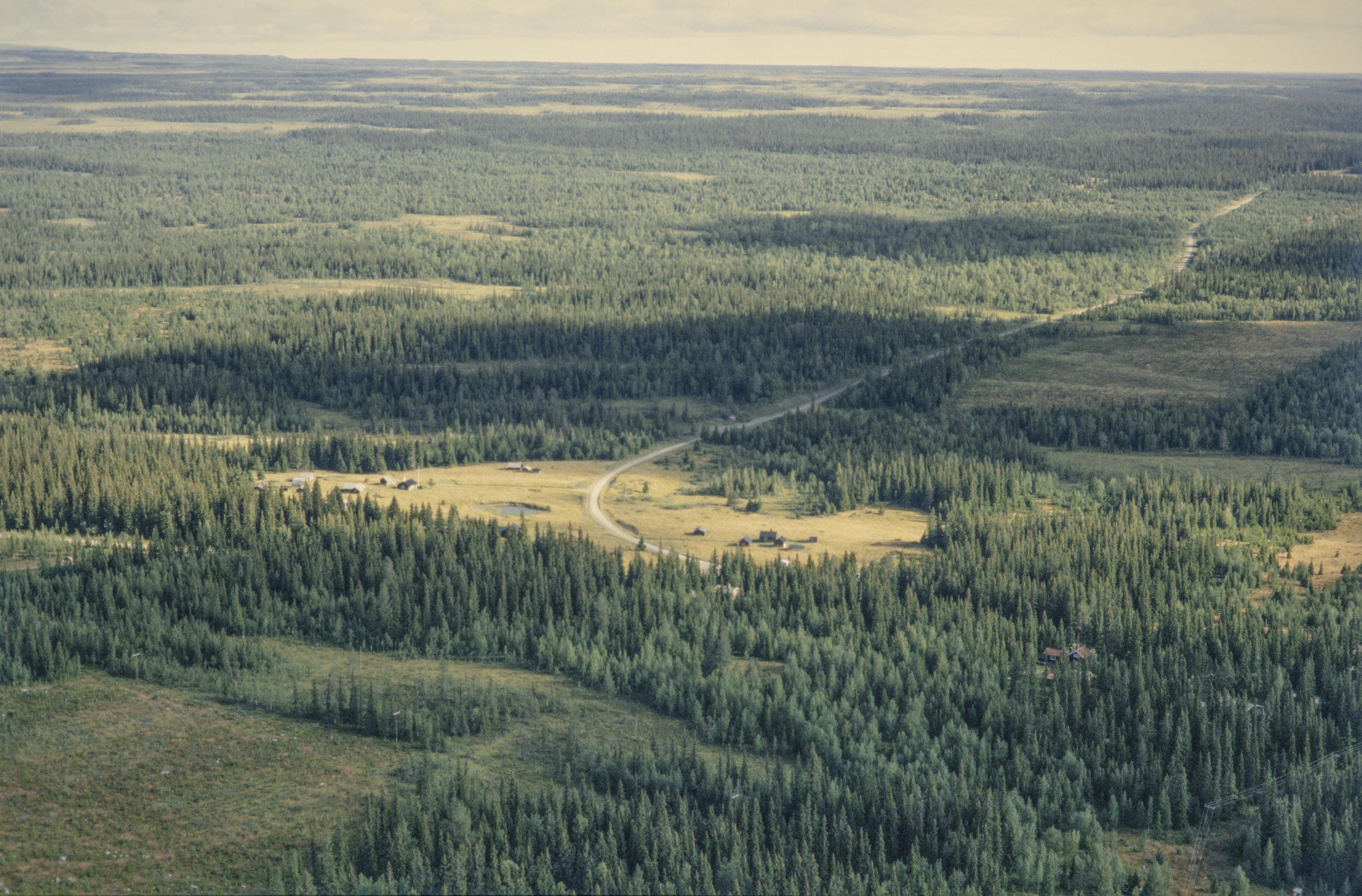 Beskrivning: Galåbodarna i Ovikfjällens fäbodområde, Fäbodområdet Svedjebodarna till höger över bildens mitt. Bilden är tagen mot (väderstreck): NNO