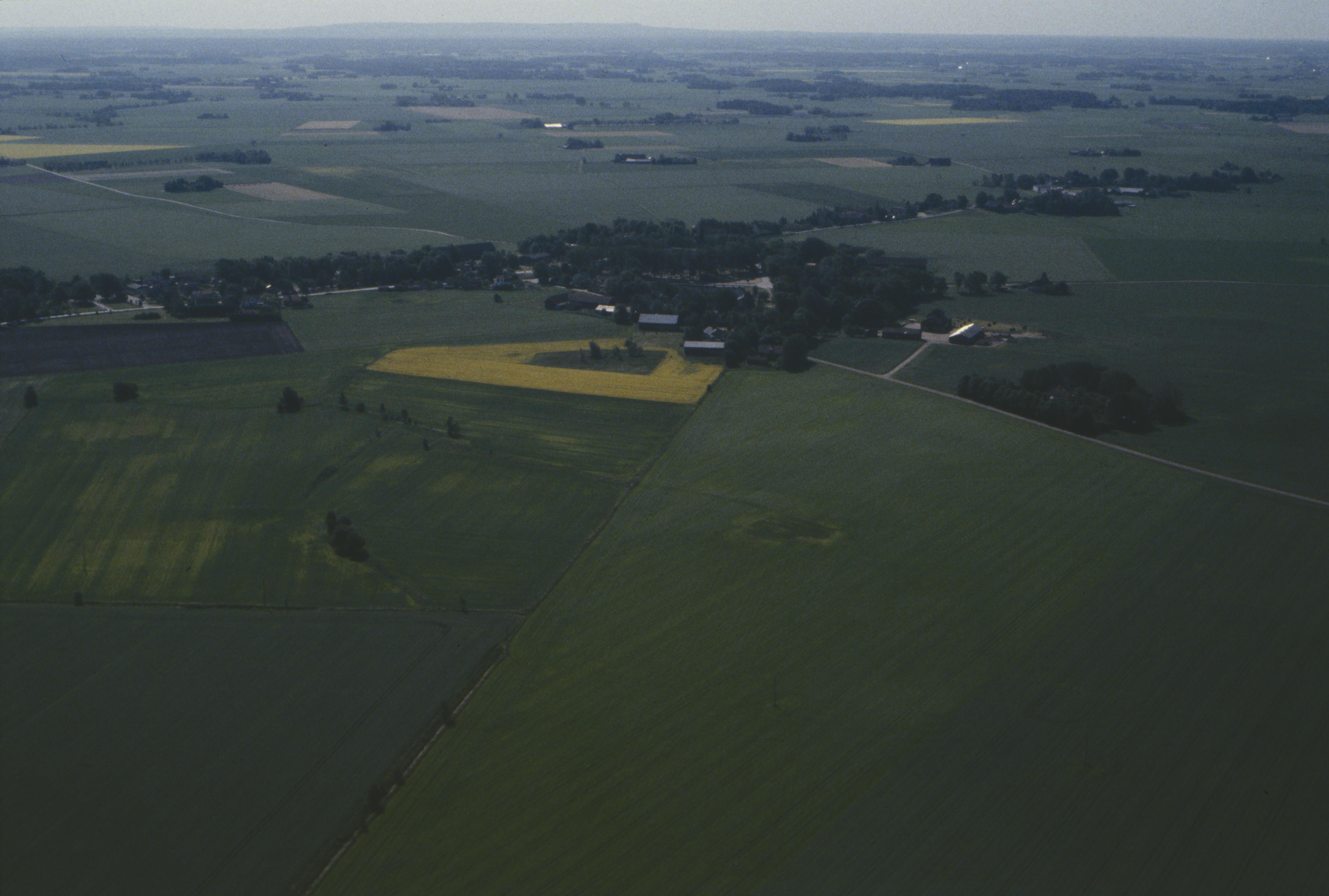 Beskrivning: Vid bildens mitt stensättning RAÄnr Saleby 42:1. Över bildens mitt Saleby kyrka och kyrkby. Bilden är tagen mot (väderstreck): SO