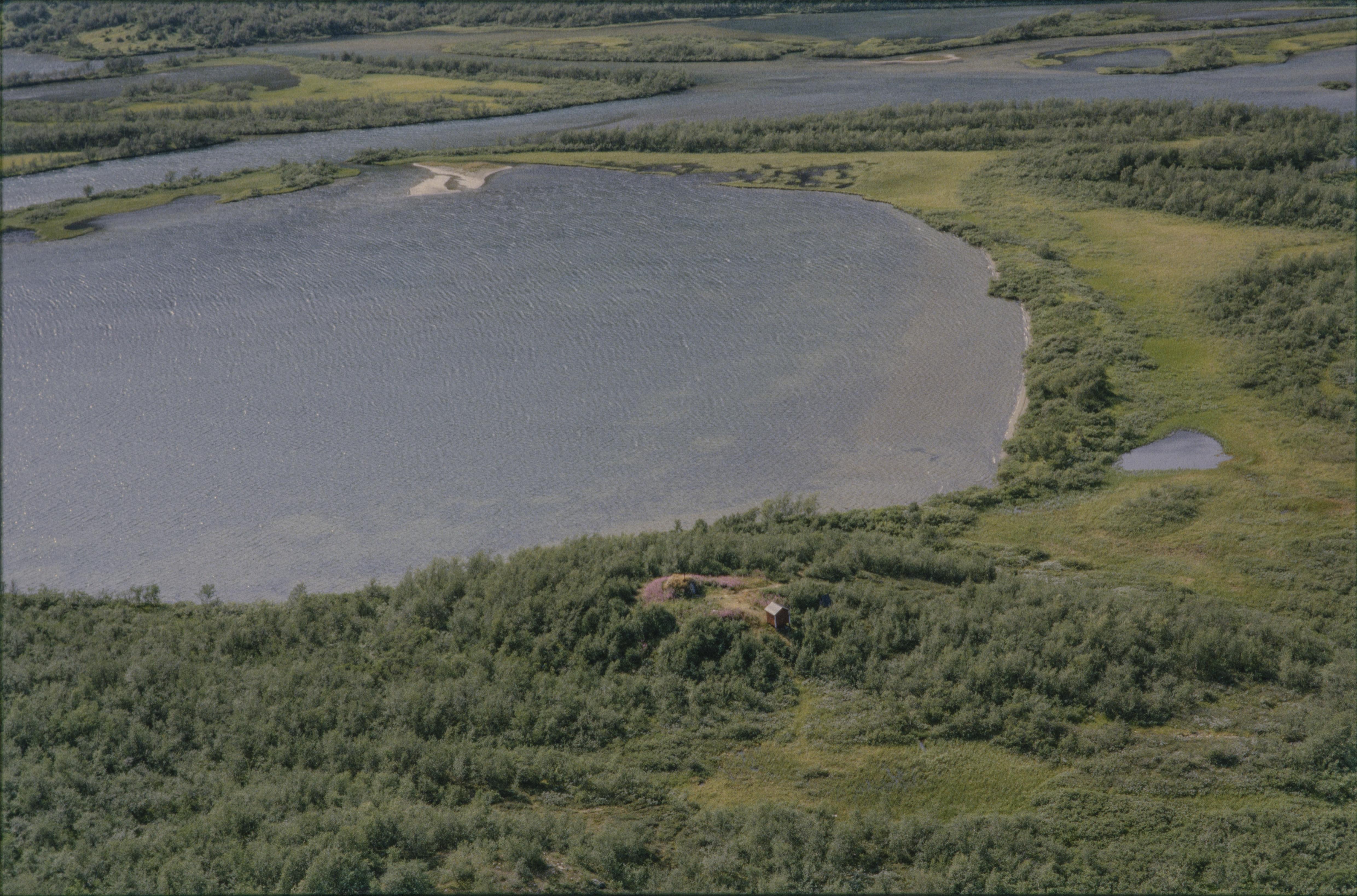 Beskrivning: Sjön Rautasjaure (Rávttasjávri). I bildens övre deltat där åarna Aliseatnu, Báhkkabahoknjira och Goalkásjohka mynner ut i västra ändan av sjön. I bildens nedre del kåtor RAÄnr Jukkasjärvi 188:1-2 vid Rautasjaurekåtan. I bildens övre kant viste RAÄnr Jukkasjärvi 170:1. Bilden är tagen mot (väderstreck): S