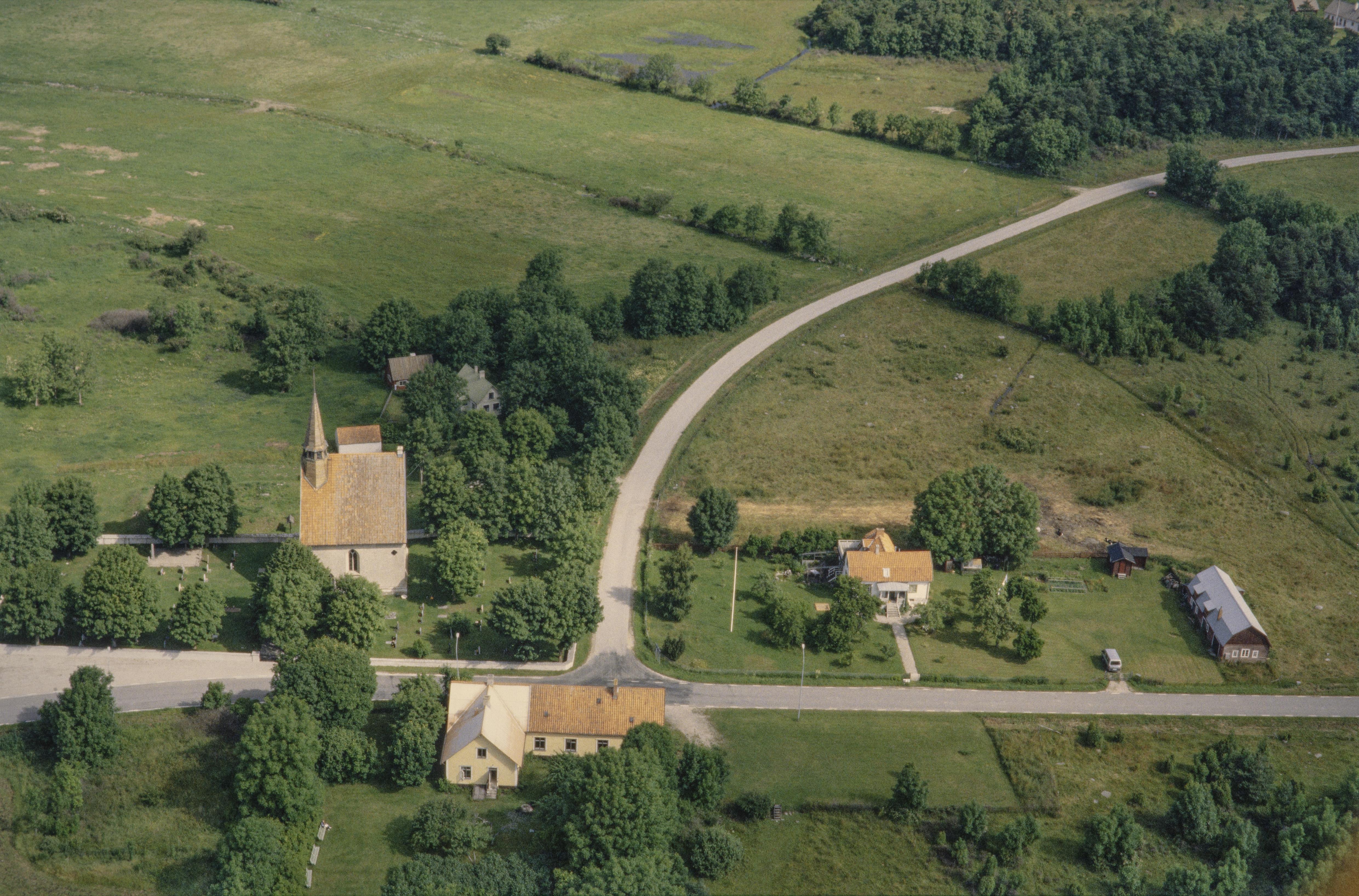 Beskrivning: Västergarns kyrka RAÄnr Västergarn 125 till vänster under bildens mitt. (Bilden tillhör även Riksintresse-nr I23 - Paviken - Västergarn.) Bilden är tagen mot (väderstreck): N