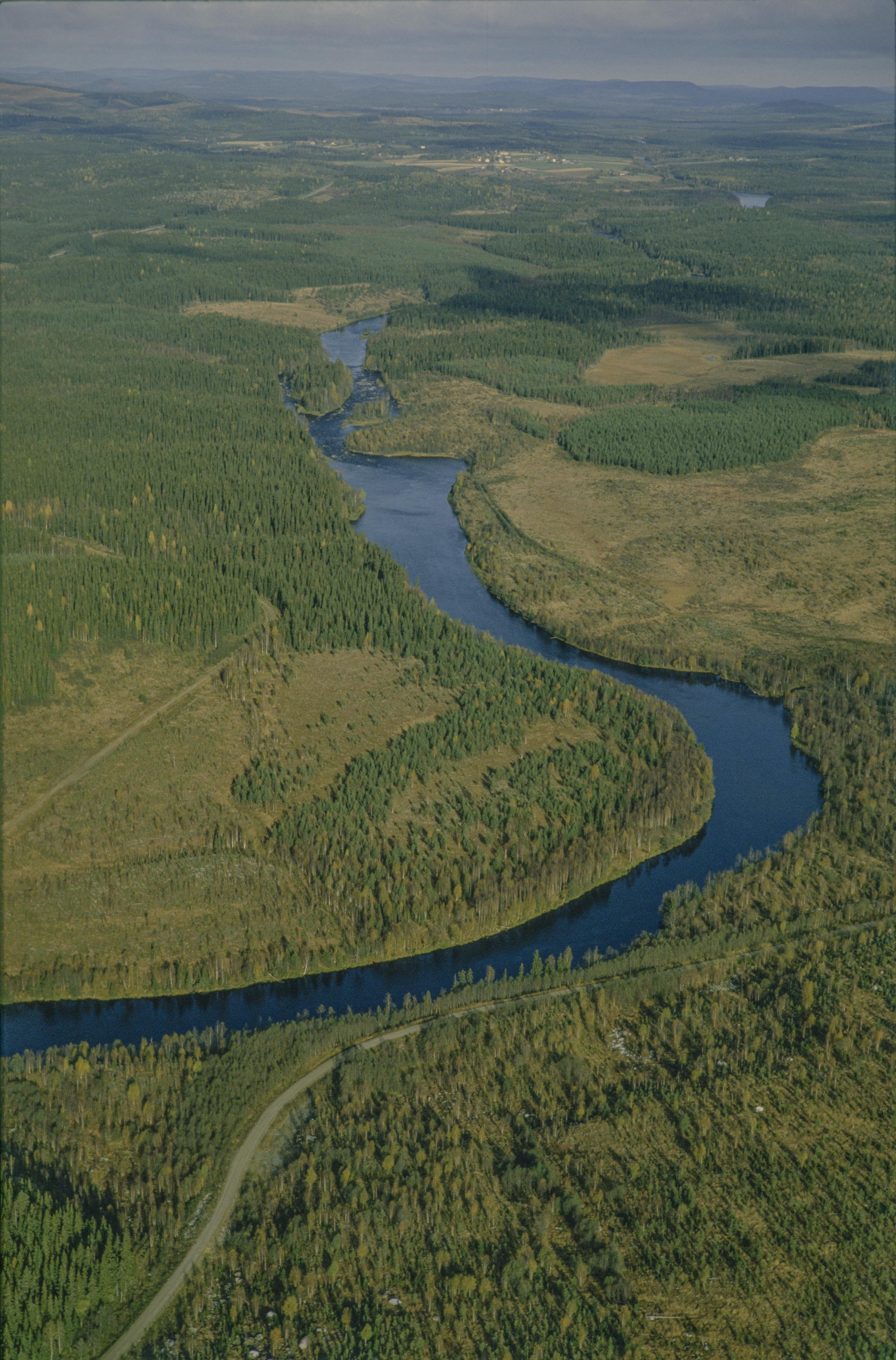 Beskrivning: Gideälvens dalgång väster om Mattarbodberget. Över bildens mitt Oxholmen i Mattarbodforsen söder om skogbrukslämning (rotvältor) RAÄnr Björna 276:1. Området Gåsmyran uppe till höger. Bilden är tagen mot (väderstreck): NNV