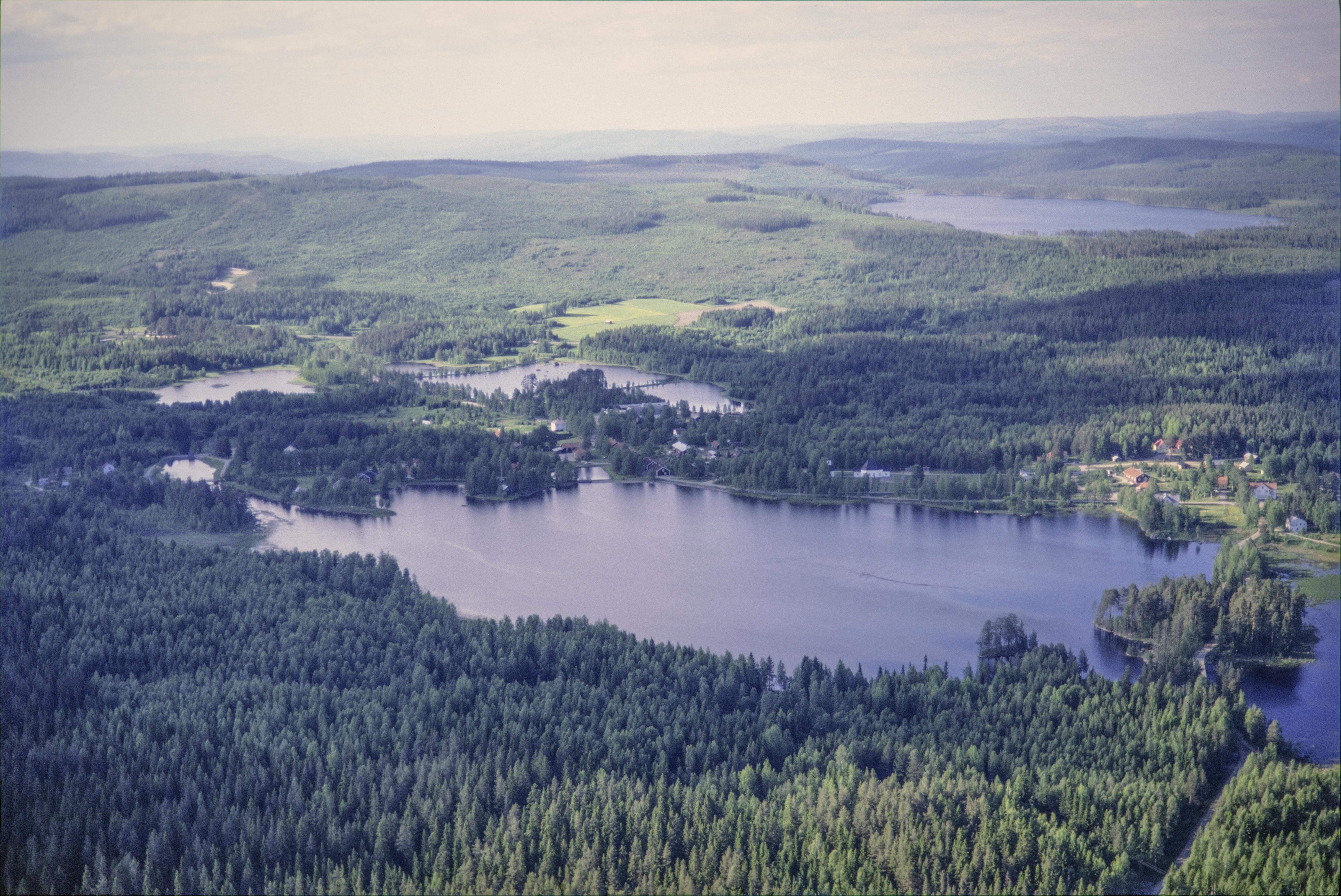 Beskrivning: Graninge bruk vid Bruksån och sjön Brukstjärnen. Hytt- och hammarområde RAÄnr Graninge 232:1-2. Graninge kyrka skymtas bland träden vid stranden i bildens mitt. Bilden är tagen mot (väderstreck): N