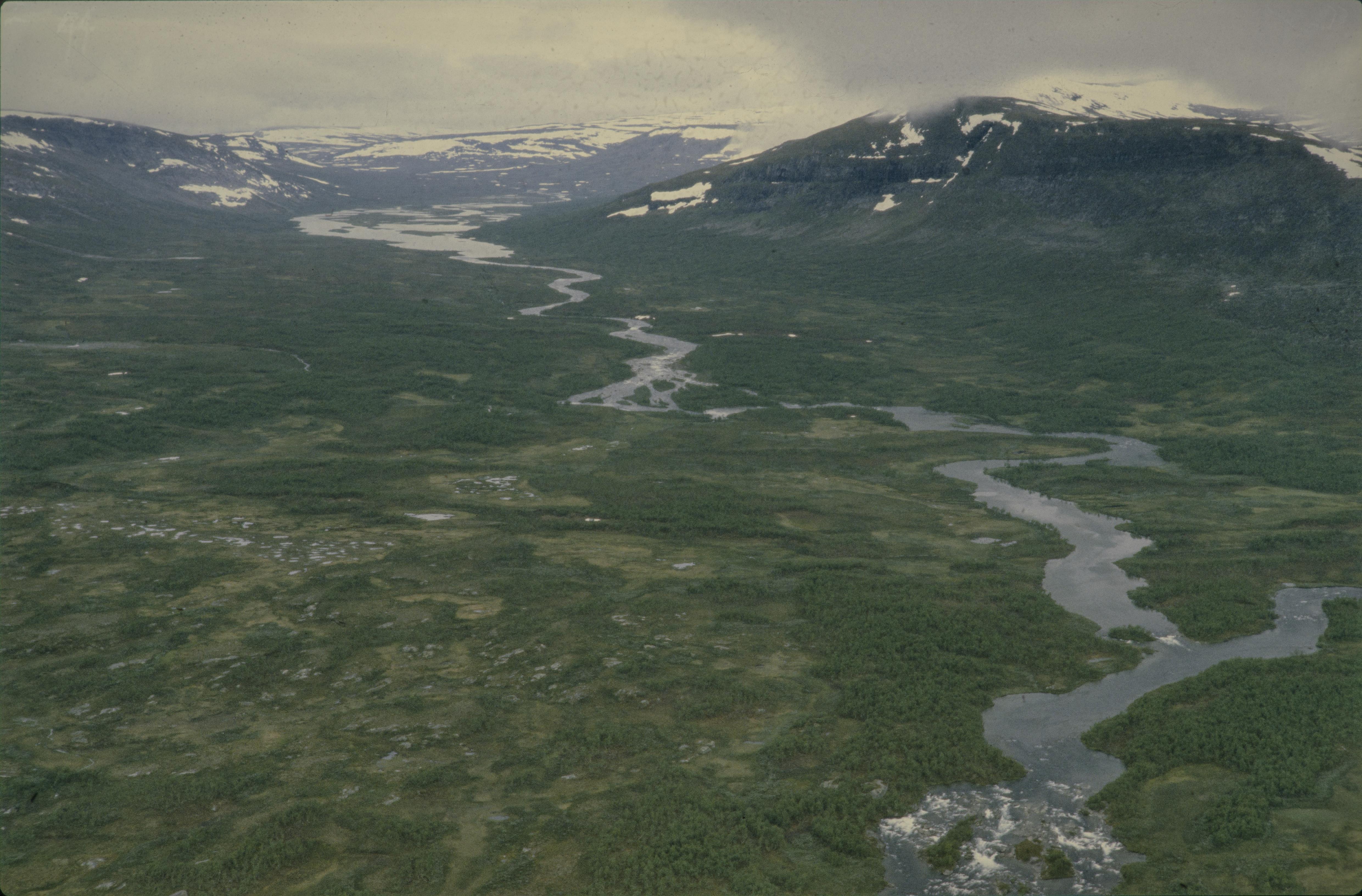 Beskrivning: Anmärkning (övrig): Diabilden tillhör en pärm som innehåller rapporten "Sädvajaur. Lars Bergström 1975 och Jan Norrman 1983". Pärmen finns i Jan Norrmans flygbildsarkiv. Riksintresse-nr/namn: BD4 - Nasafjäll. Socken: Arjeplog. Motivering: Gruva och gruvby med lämningar efter Nasafjälls silvergruva som tillmättes en stor nationell betydelse för Sveriges stormaktssträvanden under 1600- och 1700-talen. (Gruvmiljö). - Uttryck för riksintresset: Gruvhål, gruvgångar, skärpningar, slagghögar, kapellruin, gravplats, ruiner och grunder efter kokhus, smedja, gruvstugor och bokhus, rester av rälsbana samt en restaurerad gruvstuga från 1800-talet. [Texten uppdaterat av Riksantikvarieämbetet våren 2013.] Beskrivning: Färdvägen Nasaleden i området Smuolevágge, halvvägs mellan området Ruonekgårttje vid sjön Sädvajaure (Sädvvájávrre) och Nasafjäll (Nása). Nere till höger rinner ån Vávlávágge in i ån Smuolejåkkå (Smuolejåhkå). Till höger om bildens mitt en bro där färdvägen böjer av vidare mot Nasafjäll uppe till vänster. Bilden är tagen mot (väderstreck): VNV Fotosyfte: Flygbildsdokumentation