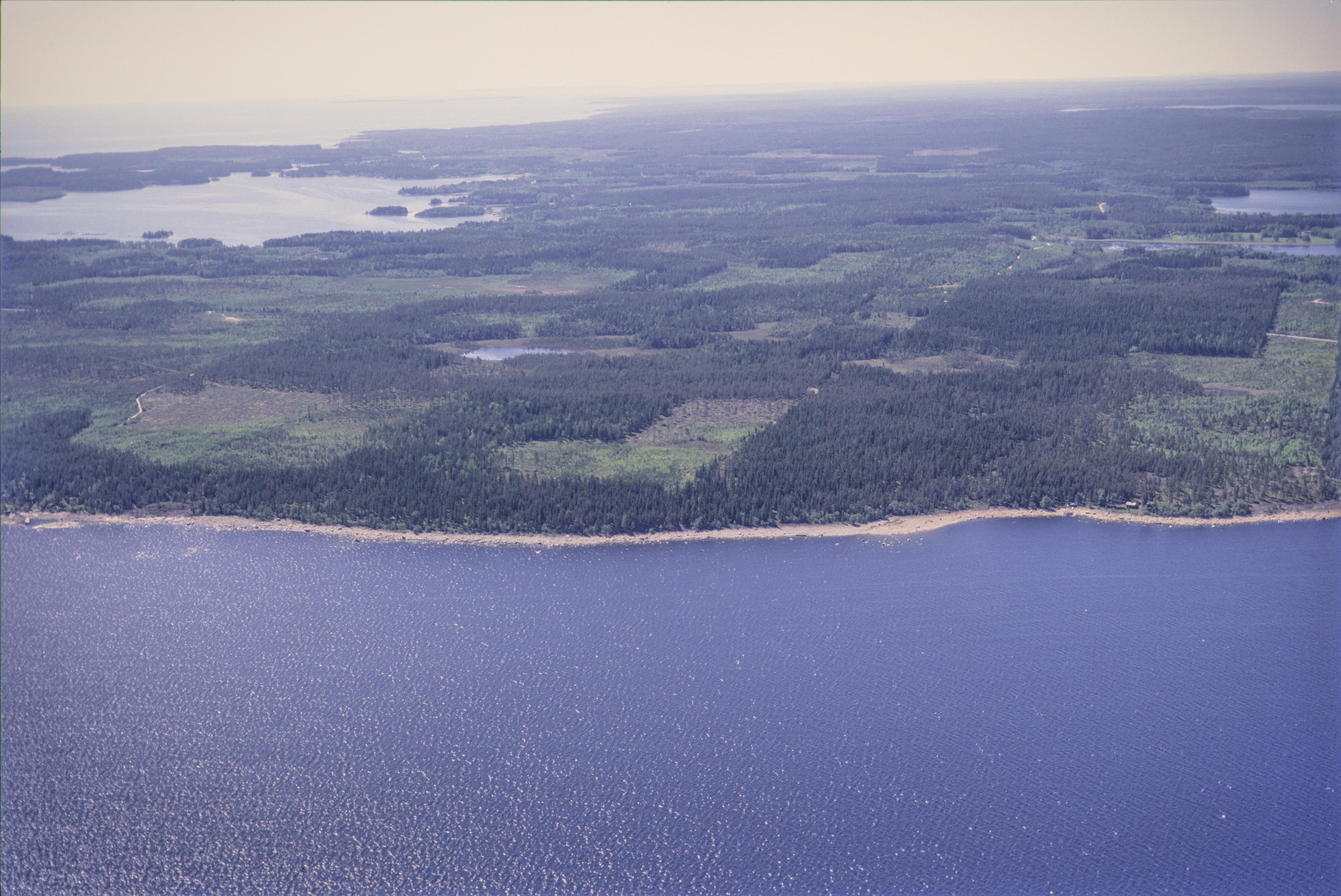 Beskrivning: Björkön, Njurundakusten. Över bildens mitt området mellan Hälludden och Bergaudd, öster om Bergafjärden. Till vänster skogbrukslämningar RAÄnr Njurunda 1142 och 1150 vid Ässjötjärnen. till höger röse RAÄnr Njurunda 482:1. Bilden är tagen mot (väderstreck): S