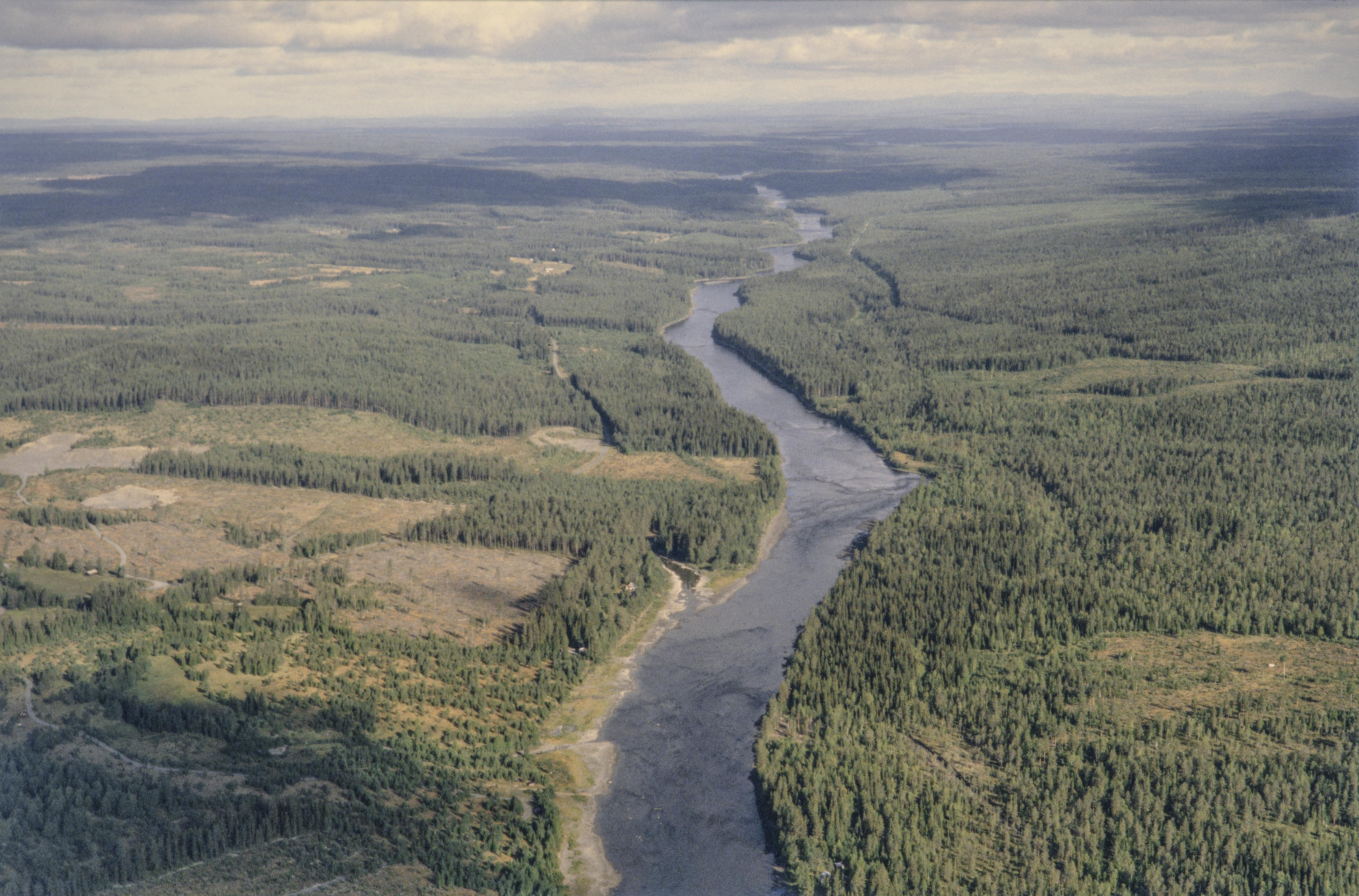 Beskrivning: Älven Hårkan som markerar gränsen mellan socknen Lit (till vänster) och Häggenås. Vid bildens mitt fångstgropssystem RAÄnr Lit 37:1 vid Holmviken. Till höger om bildens mitt Kvarnbäckens utlopp. I bildens övre del områdena Mångbodarna och Stenängesbrännan. Bilden är tagen mot (väderstreck): N