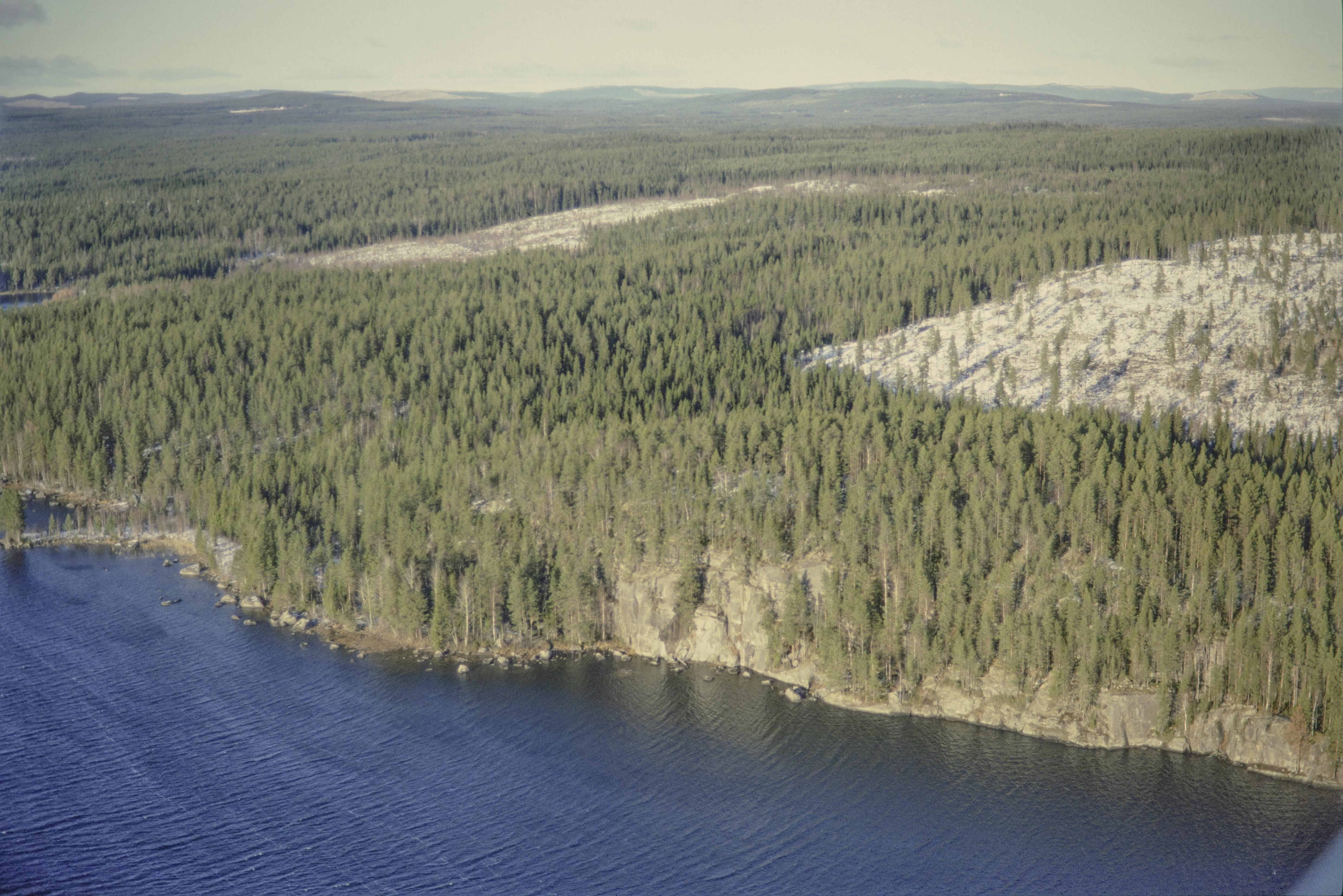 Beskrivning: Fångsjön, nordöstra området. Under bildens mitt Fångsjöberget med hällmålningar RAÄnr Ström 332:1-3. Åsberget i bildens övre del. Bilden är tagen mot (väderstreck): N