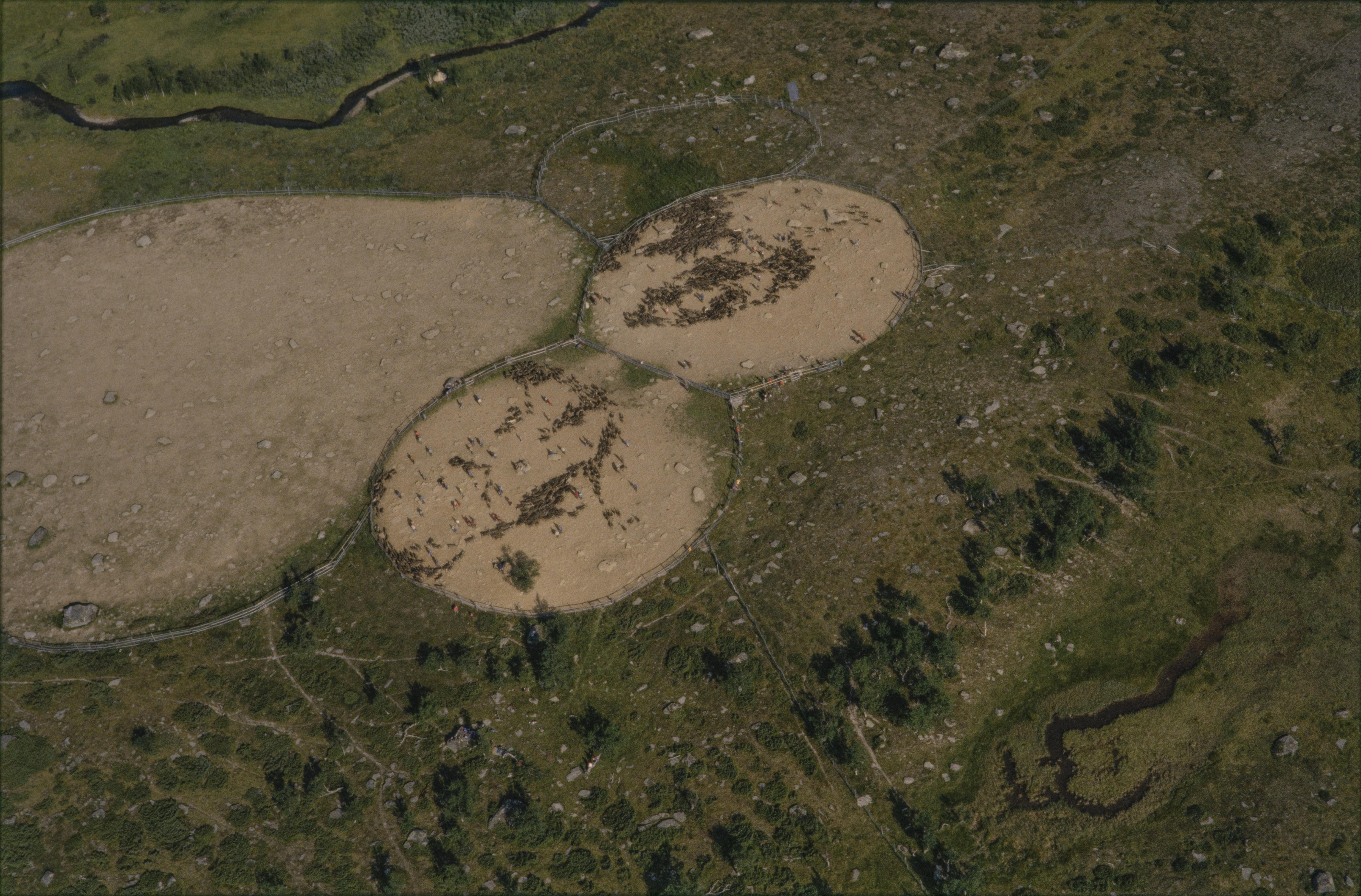 Beskrivning: Rengärden med renskiljning (rarkning) i samevistet Parka (Bárkka). På sydsidan av rengärden ett fångstgropssystem RAÄnr Arjeplog 327:1. Bilden är tagen mot (väderstreck): NV