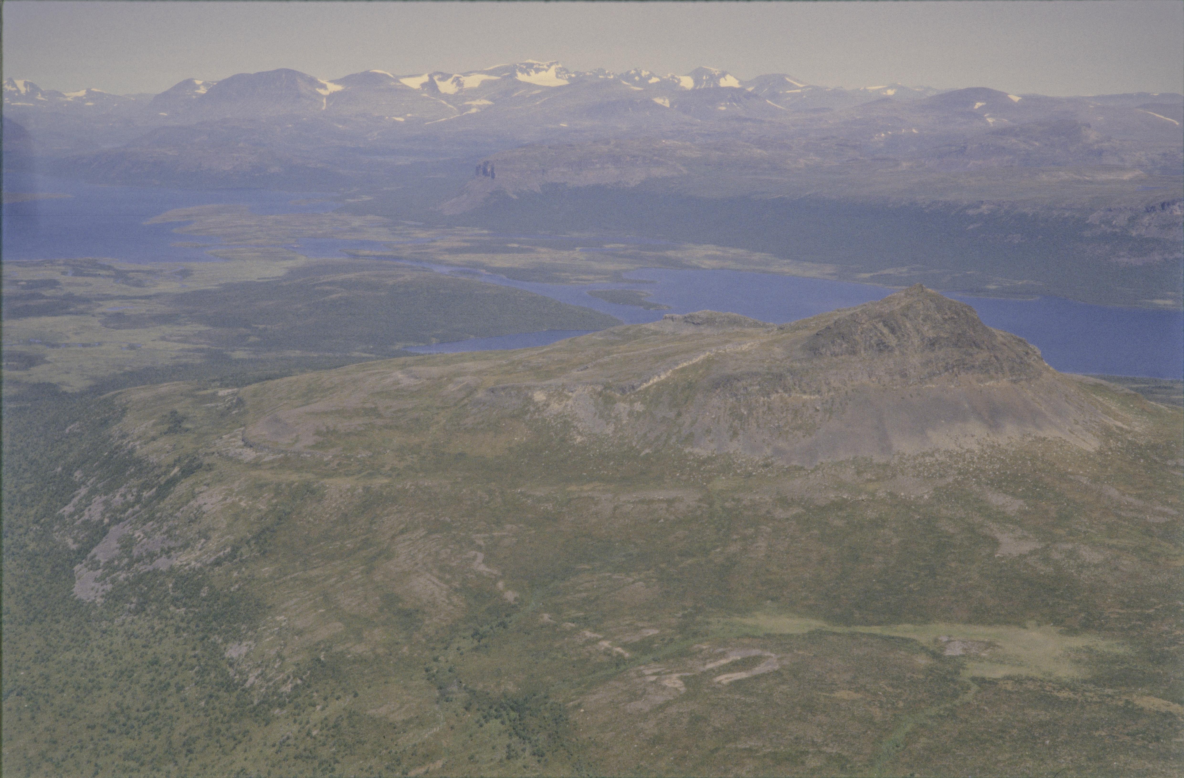 Beskrivning: Till höger fjället Akkavare (Áhkávárri) med offerplats RAÄnr Gällivare 60:1 i området vid sjön Läffasaiva (Laeffásáiva). I bildens övre del sjön Vuoleo Kaitumjaure (Vuolip Gáidumjávri). Sjaunja naturreservat. Bilden är tagen mot (väderstreck): N