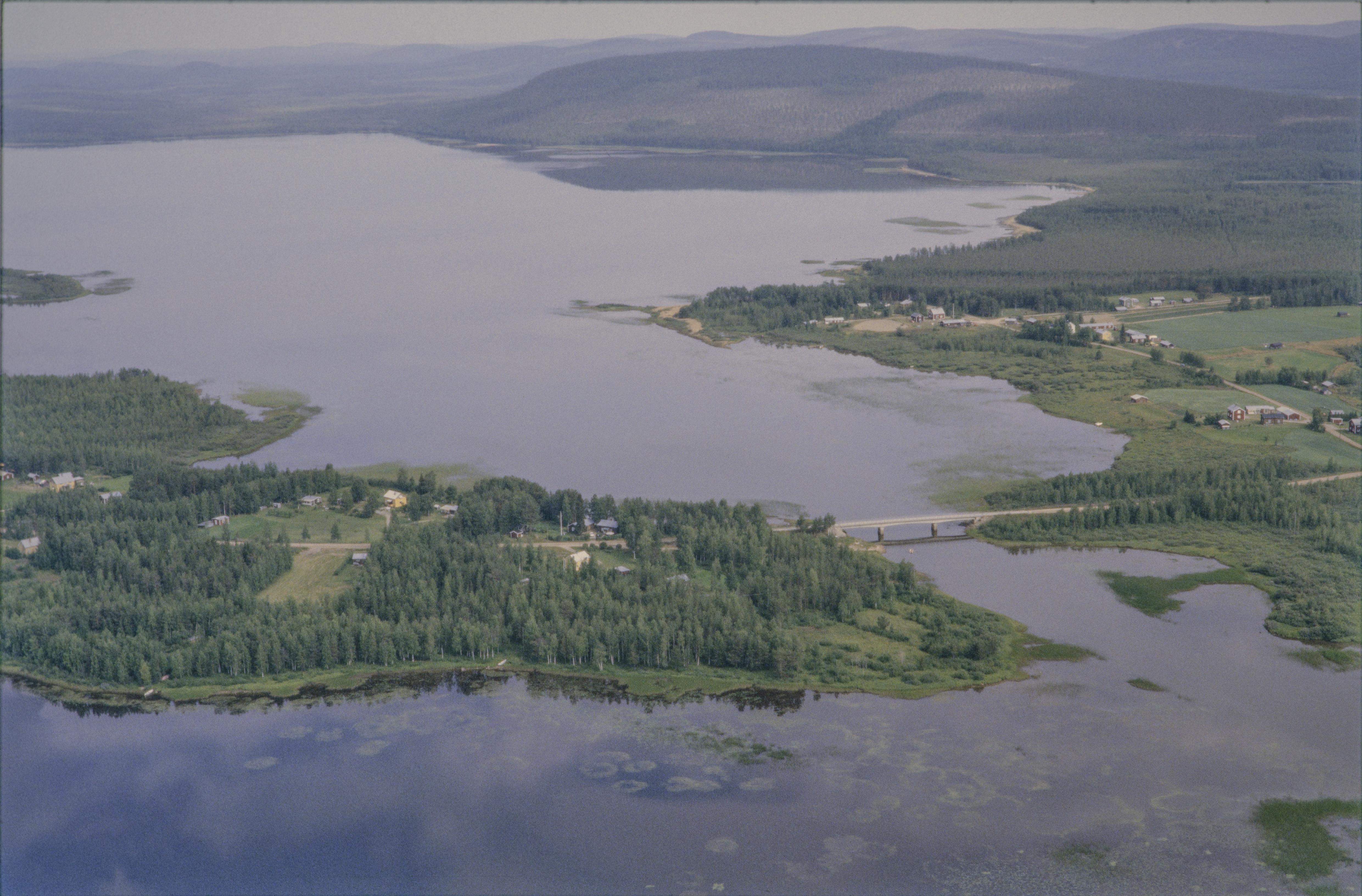 Beskrivning: Till höger under bildens mitt en vägbro över Storsundet i sjön Övre Lansjärv. Till höger om bildens mitt området Sanningslandet. Till höger över bildens mitt området Stubblandet med boplats RAÄnr Överkalix 9:1. Bilden är tagen mot (väderstreck): N