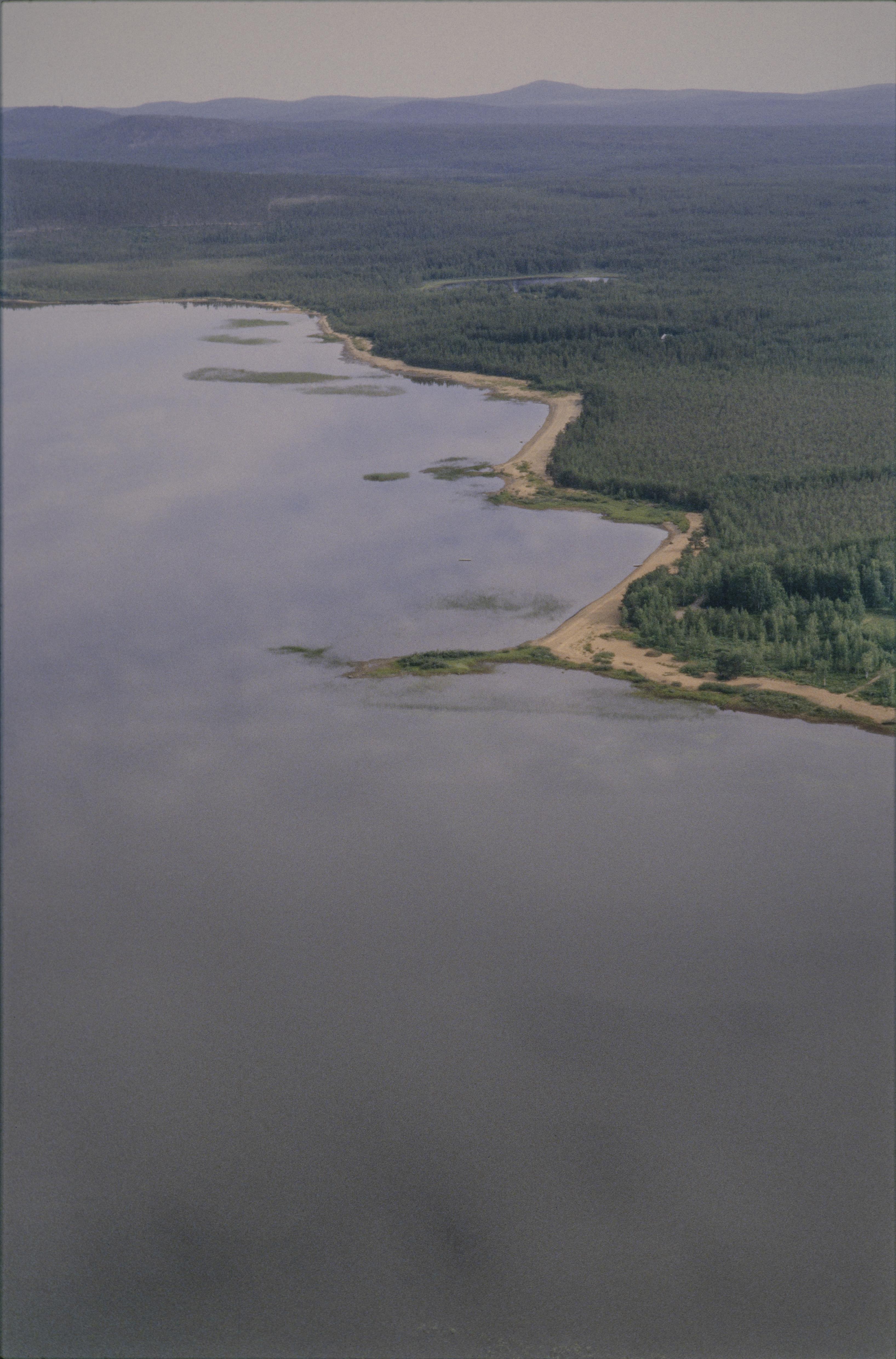 Beskrivning: I bildens nedre del norra delen av Storsundet i sjön Övre Lansjärv. Till höger om bildens mitt området Stubblandet med boplats RAÄnr Överkalix 9:1. Bilden är tagen mot (väderstreck): NNO