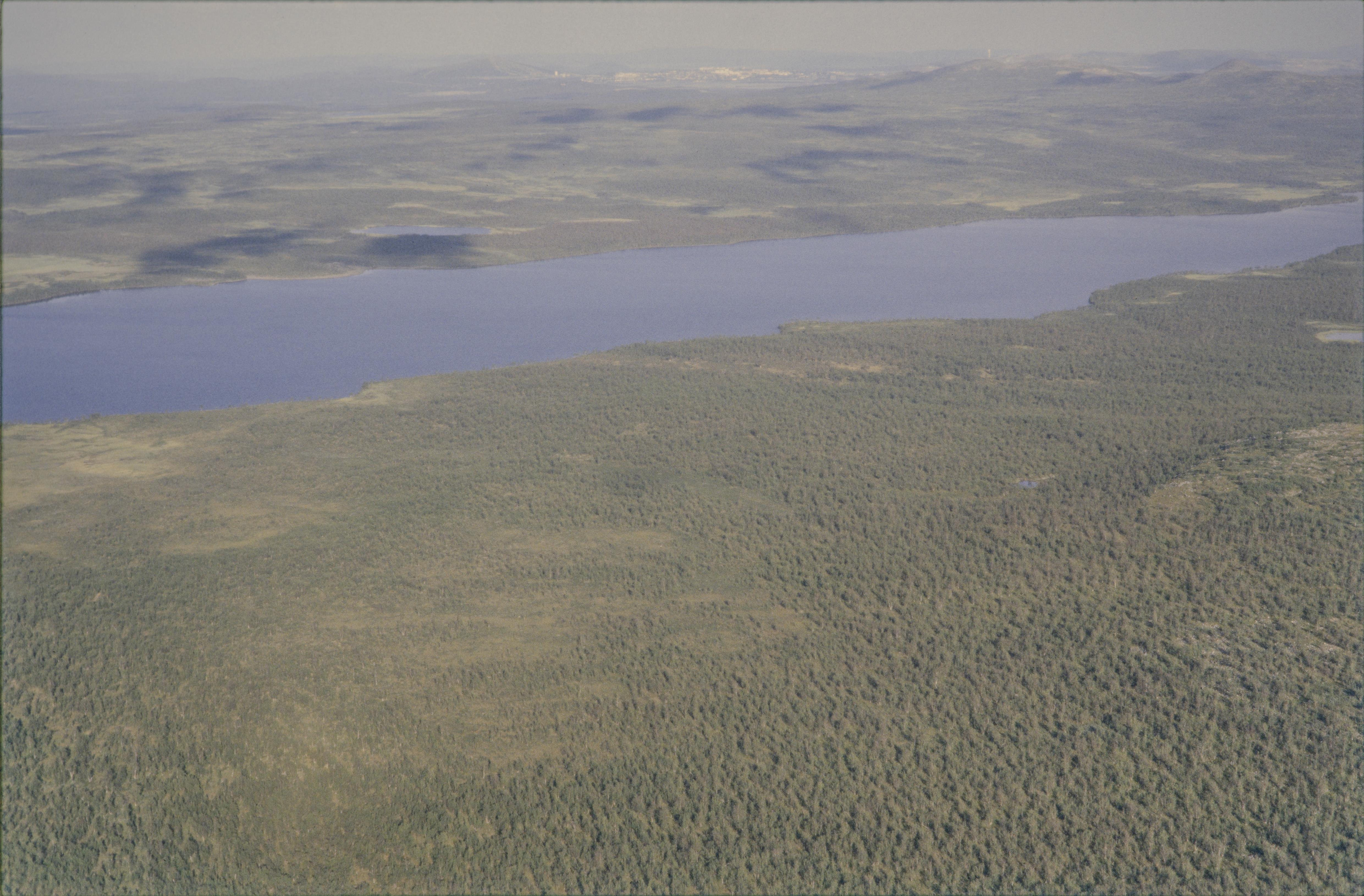 Beskrivning: Sjön Eatnamjavri (Eatnamjávri) över bildens mitt. I bildens nedre del områden väster om sjön. Till höger om bildens mitt berget Huornás. På fjället Eatnamvárri uppe till höger offerplats RAÄnr Jukkasjärvi 72:1. Kiruna (Giron) tätort i bildens övre del. Bilden är tagen mot (väderstreck): Ö