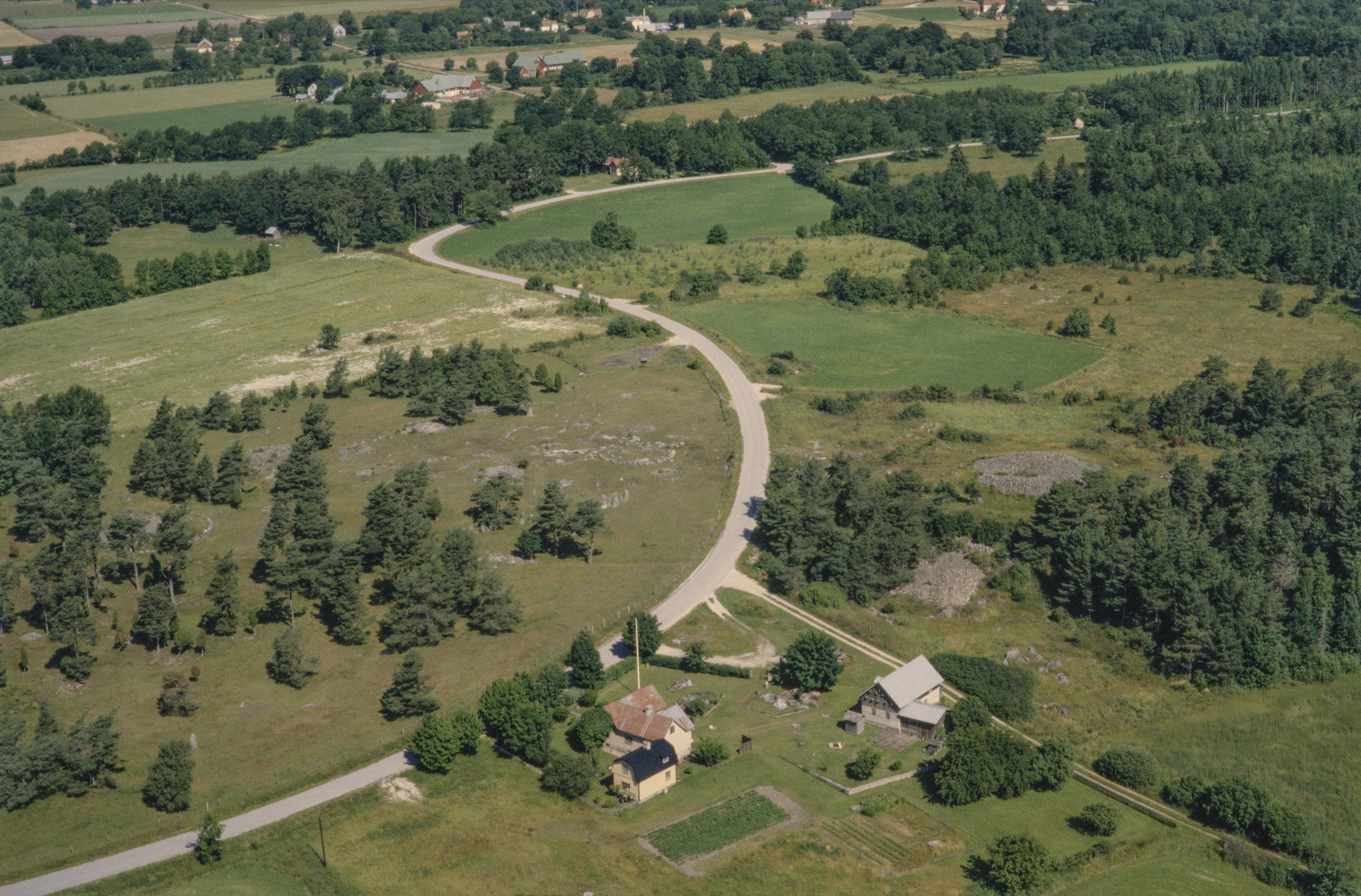 Beskrivning: På båda sidor av vägen Gålrums gravfält Alskog 9:1 med flera rösen och skeppssättningar m.m. Röset Digerrojr till höger om bildens mitt. Byarna Ollajvs och Rommunds i bildens övre del. Bilden är tagen mot (väderstreck): NV