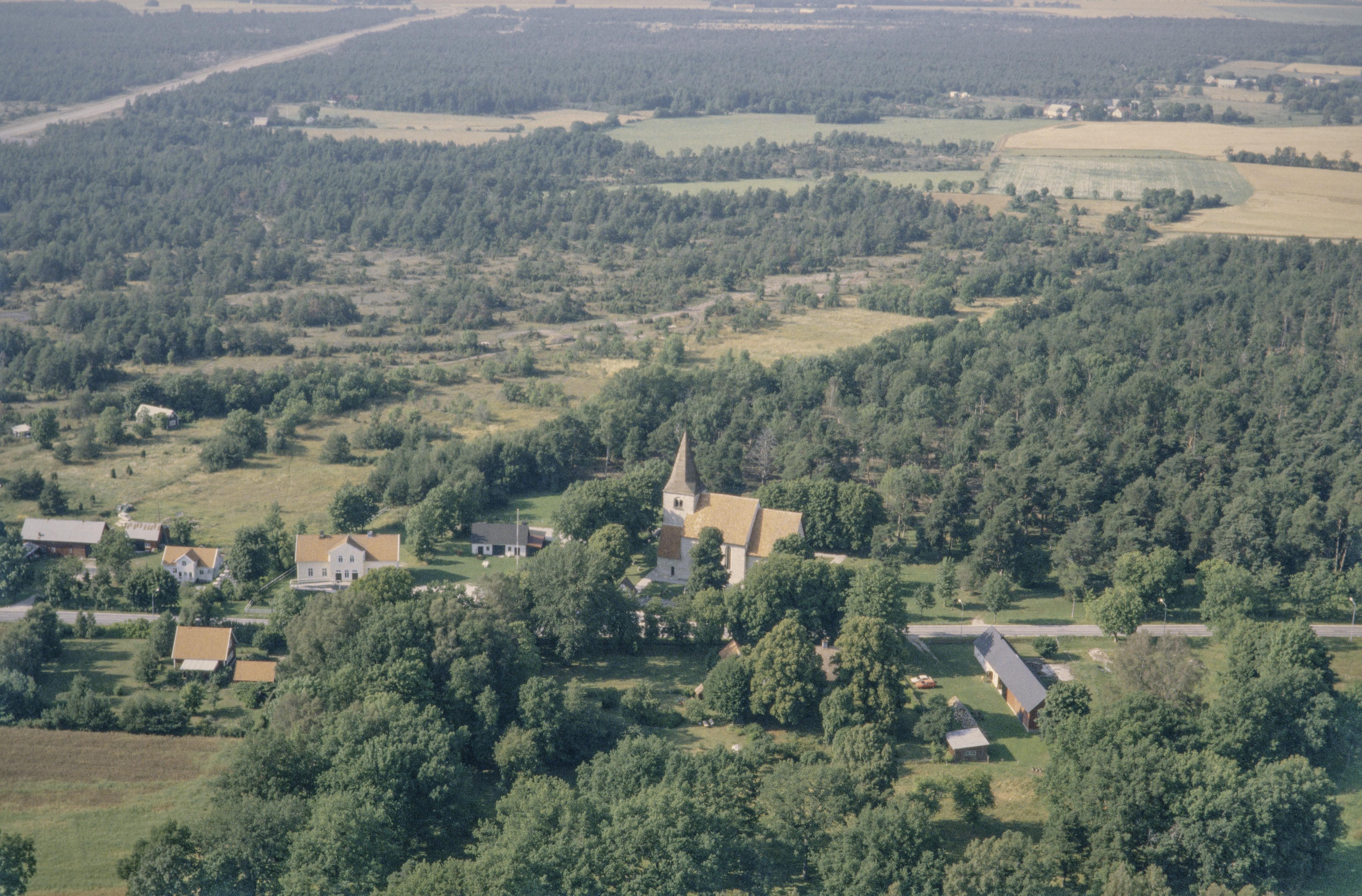 Beskrivning: Bro kyrkby. Bro kyrka i bildens mitt. I skogen till höger om kyrkan hägnad RAÄnr Bro 98:1. Bilden är tagen mot (väderstreck): NNV