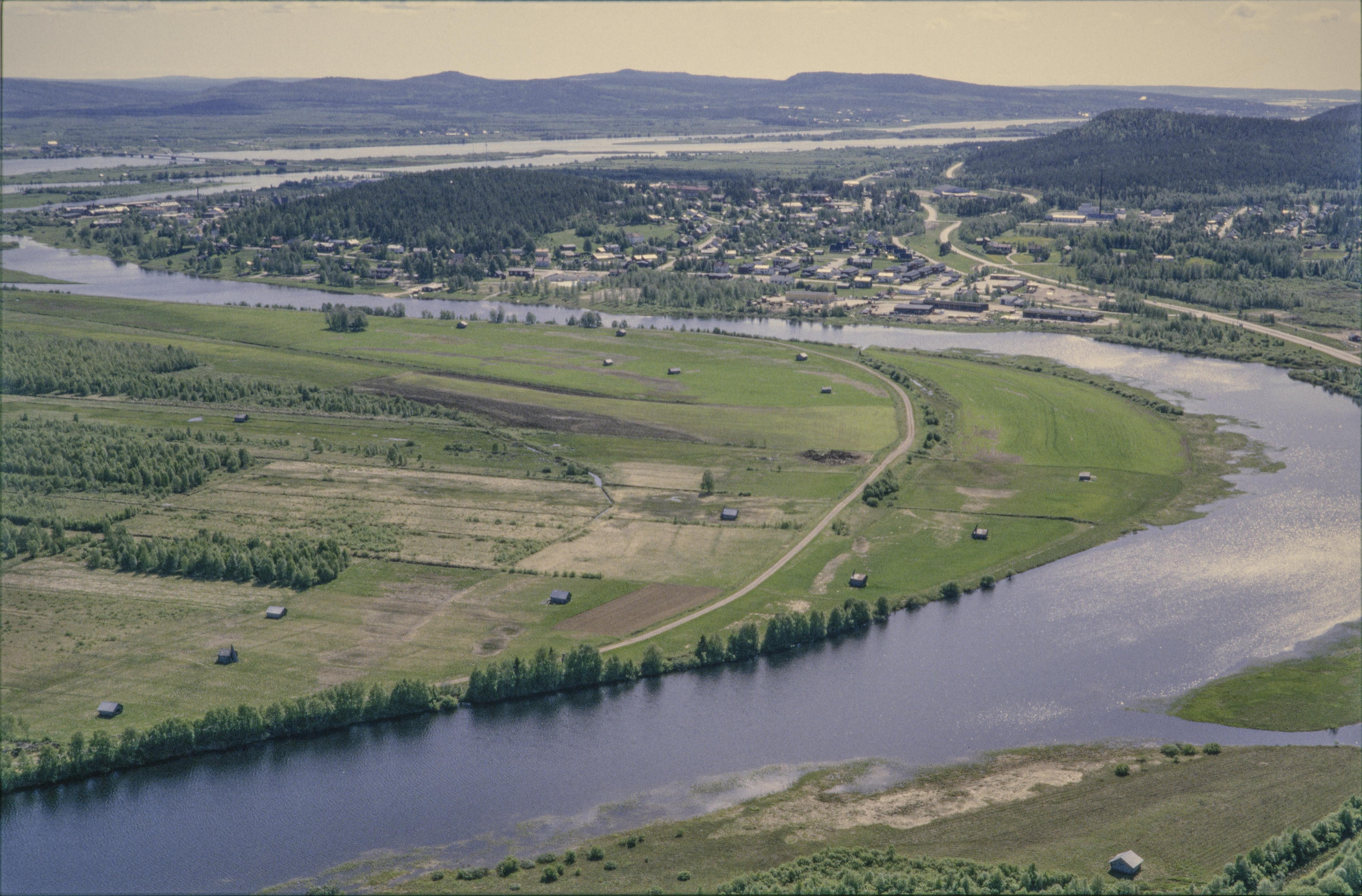 Beskrivning: Tornedalen nordost om Haapakylä by. Ängslador och odlingsmark på ön Haapakylänsaari vid vattenområdet Haapakylänpuas i Torneälven. Över bildens mitt bytomt RAÄnr Övertorneå 29:1. Övertorneå tätort i bildens övre del. Bilden är tagen mot (väderstreck): SSO