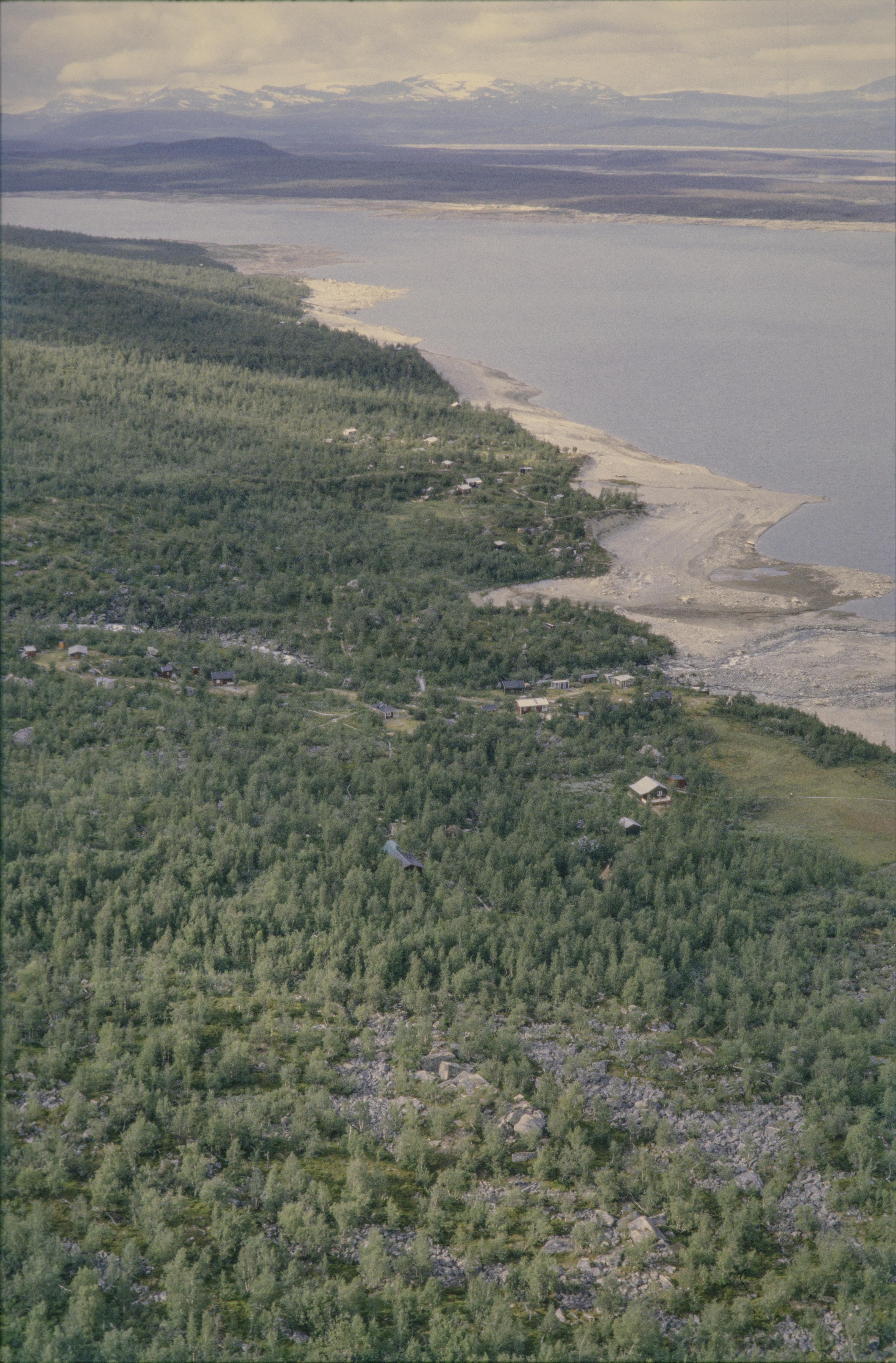 Beskrivning: Vaisaluokta (Vájsáluokta) sommarviste (för Karesuandosamer) vid sjöarna Akkajaure (Áhkájavrre) och Ritsenjaure (Rijtsemjávrre). Torvkåteläger med Vaisaluokta Kåtakyrka. I bildens vänstra kant härd RAÄnr Jokkmokk 3434:1-2. Bilden är tagen mot (väderstreck): N