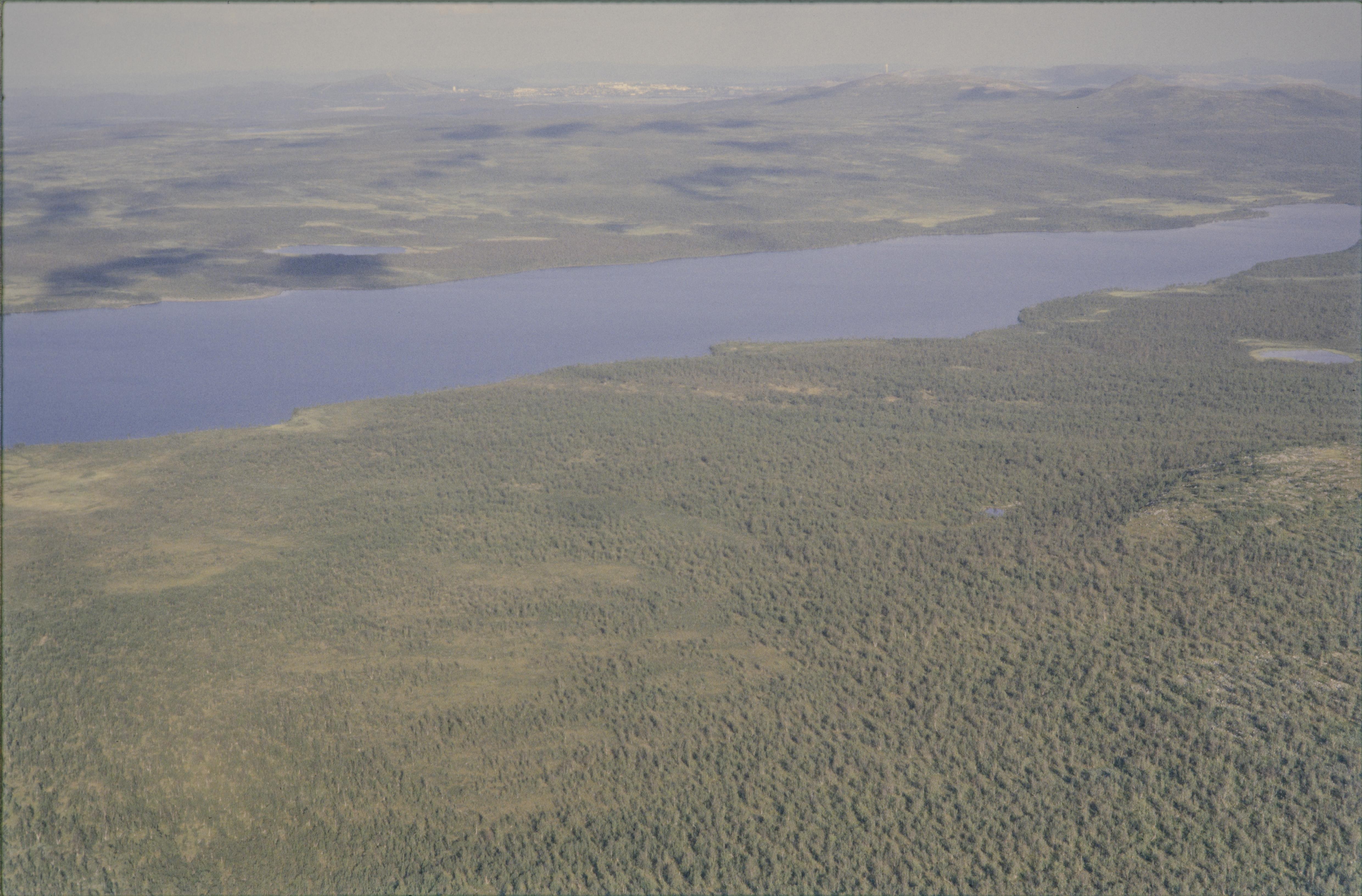 Beskrivning: Sjön Eatnamjavri (Eatnamjávri) över bildens mitt. I bildens nedre del områden väster om sjön. Till höger om bildens mitt berget Huornás. På fjället Eatnamvárri uppe till höger offerplats RAÄnr Jukkasjärvi 72:1. Kiruna (Giron) tätort i bildens övre del. Bilden är tagen mot (väderstreck): Ö
