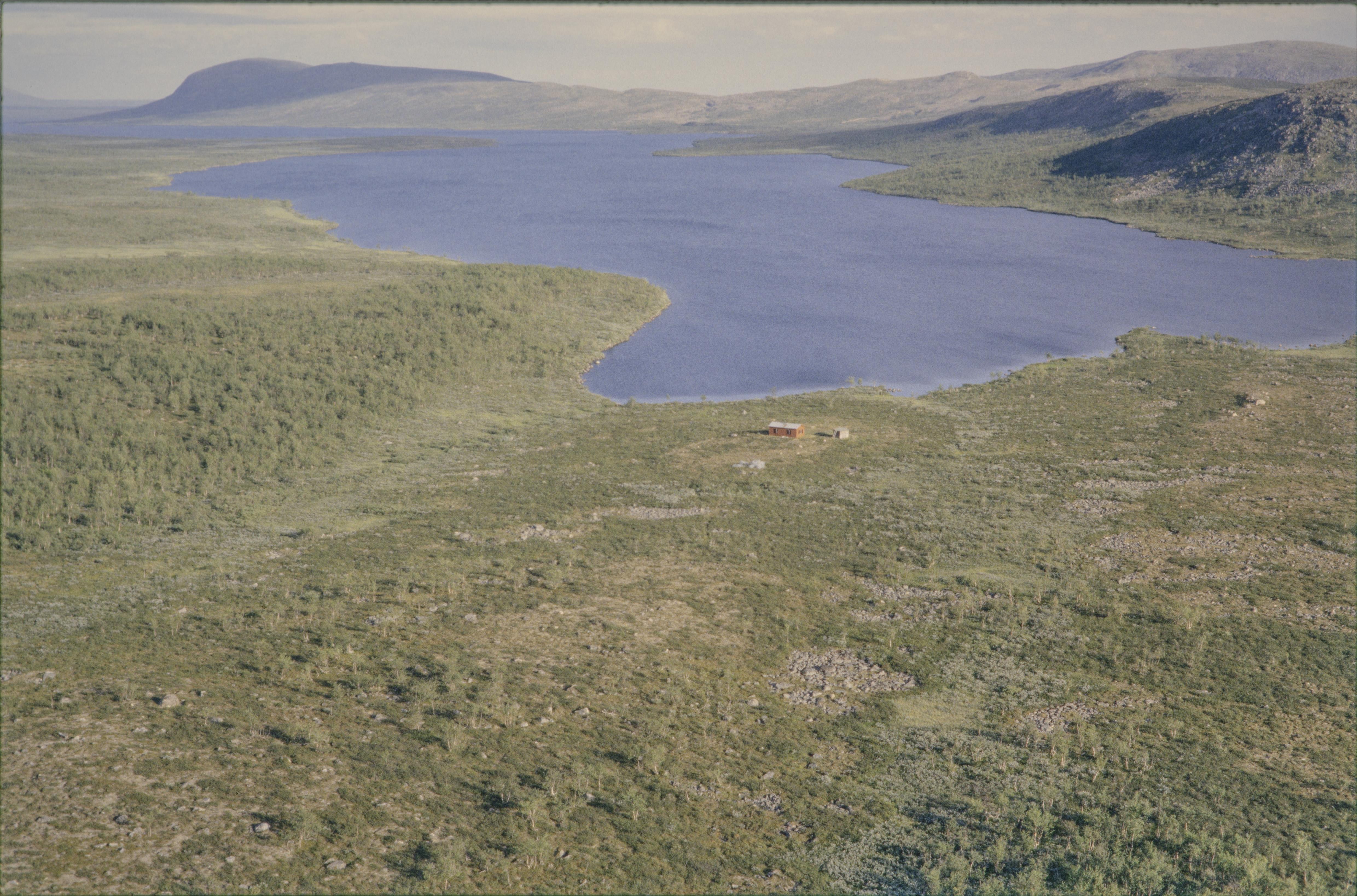 Beskrivning: Sjön Kiepanjaure (Giehpanjávri / Kiehpanjärvi). nordvästra ändan vid berget Stuor Tuoipal. Vid bildens mitt en renvaktarstuga. Till höger i bildens övre del berget Darfál. Bilden är tagen mot (väderstreck): OSO