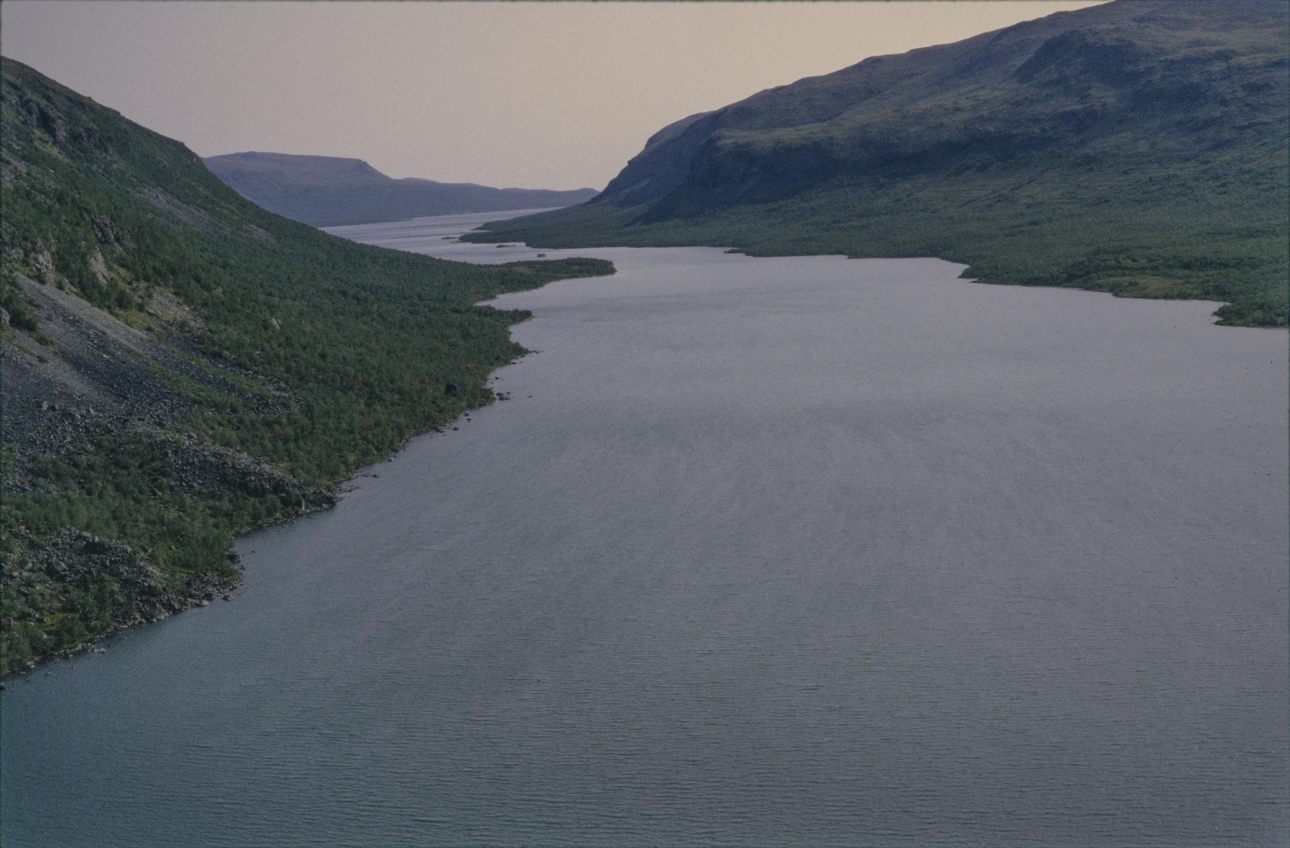 Beskrivning: Sjön Rautasjaure (Rávttasjávri) mot sydöst. I bildens övre del sundet Coalbmi och vid stranden uppe till höger viste RAÄnr Jukkasjärvi 177:1 vid bergen Várregaska och Lulip Vealevárri. Bilden är tagen mot (väderstreck): SO