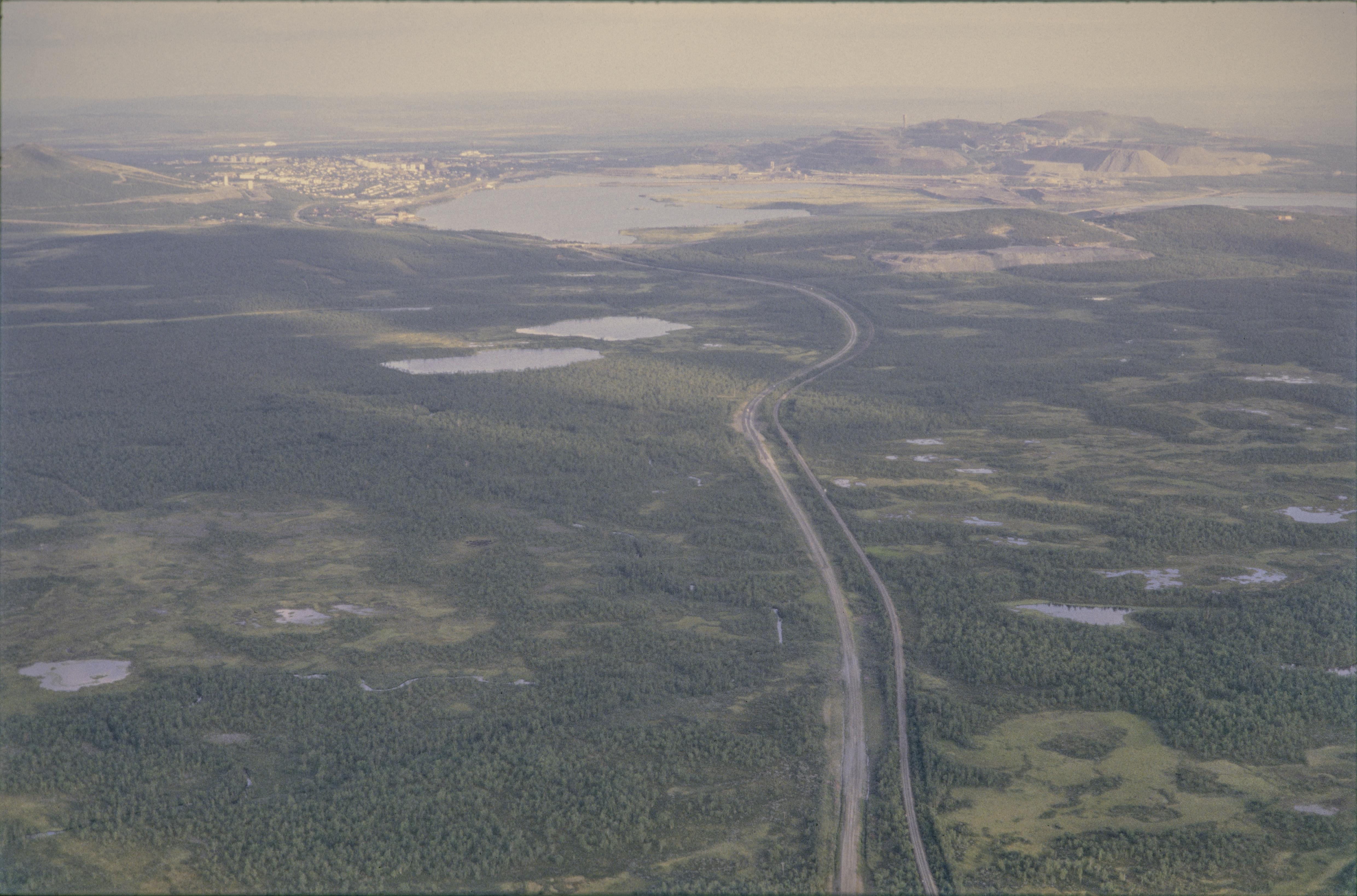 Beskrivning: Järnvägen Ofotbanen (Ofotbanan / Malmbanan) mellan Norge och Sverige i området vid Krokvik. I bildens nedre del Tiansbäcken (Vuonajohka). I bildens övre del tätorten och gruvsamhället Kiruna (Giron). Till vänster om bildens mitt gruvhål RAÄnr Jukkasjärvi 2260, m.m. Bilden är tagen mot (väderstreck): SO