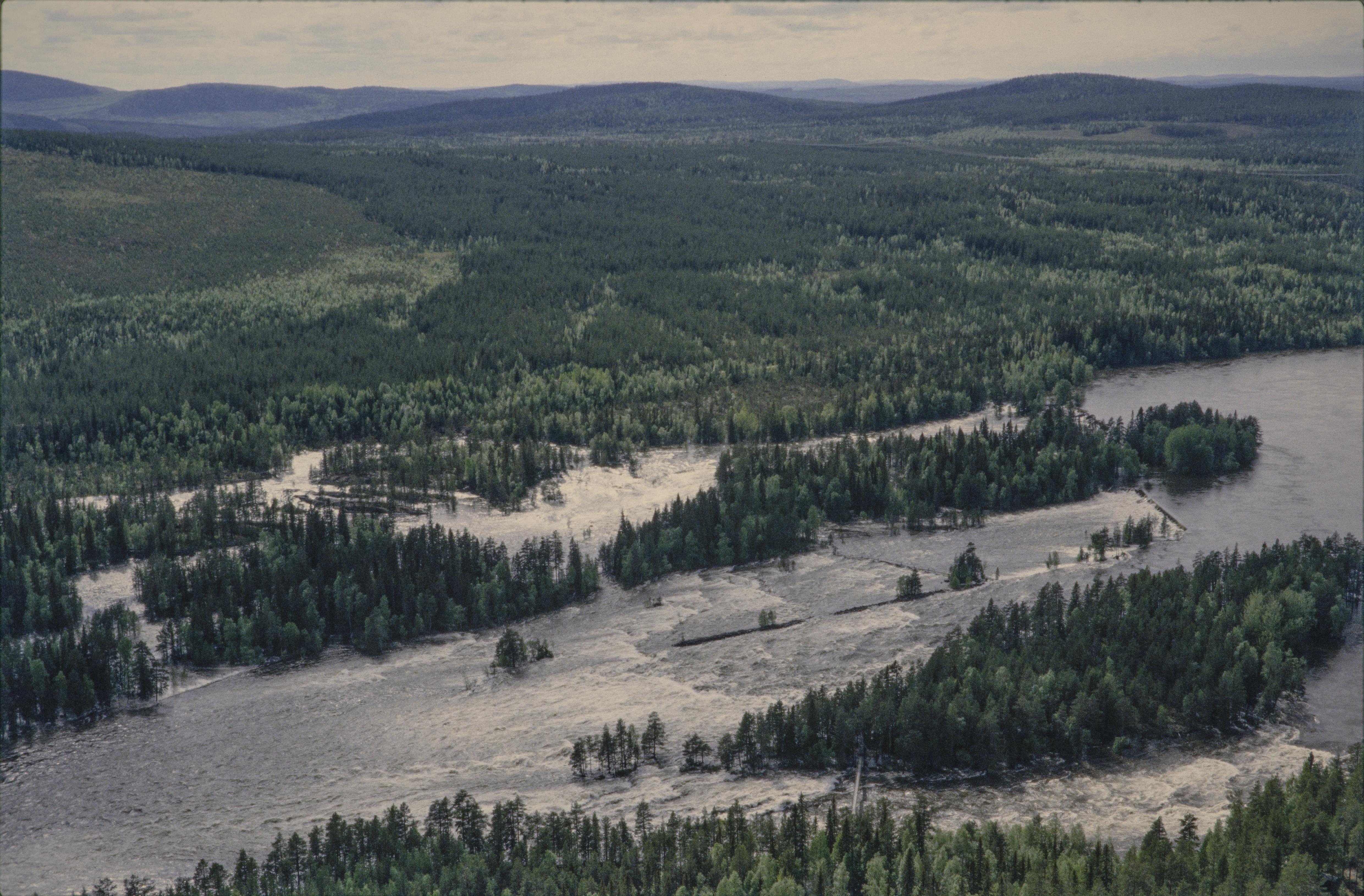 Beskrivning: Mårdseleforsen (skrivs även Mårdselforsen) i Vindeälven. Boplats RAÄnr Degerfors 602:1 vid Nedre Sikselet till höger under bildens mitt. Bilden är tagen mot (väderstreck): S