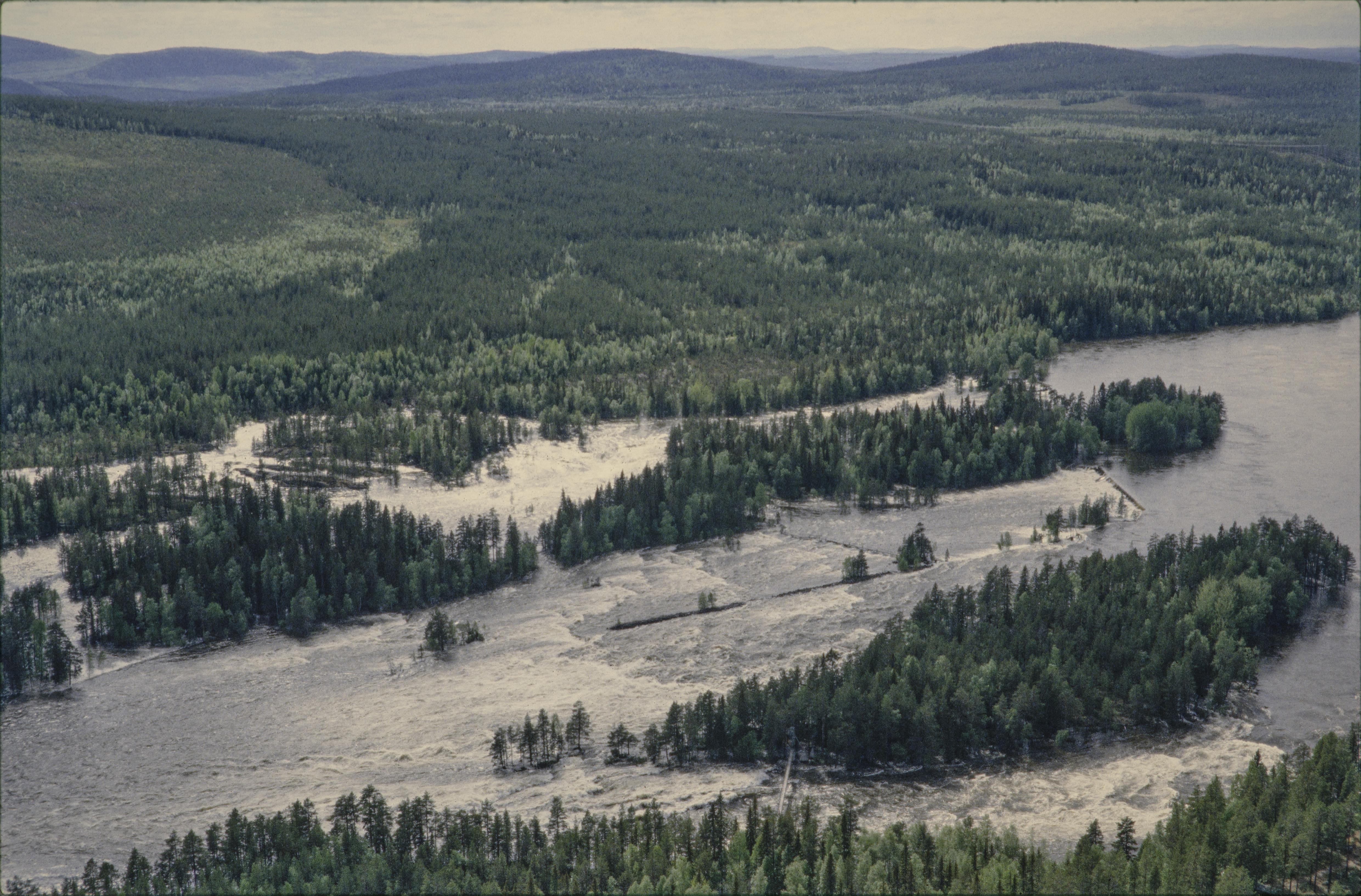 Beskrivning: Mårdseleforsen (skrivs även Mårdselforsen) i Vindeälven. Boplats RAÄnr Degerfors 602:1 vid Nedre Sikselet till höger under bildens mitt. Bilden är tagen mot (väderstreck): S