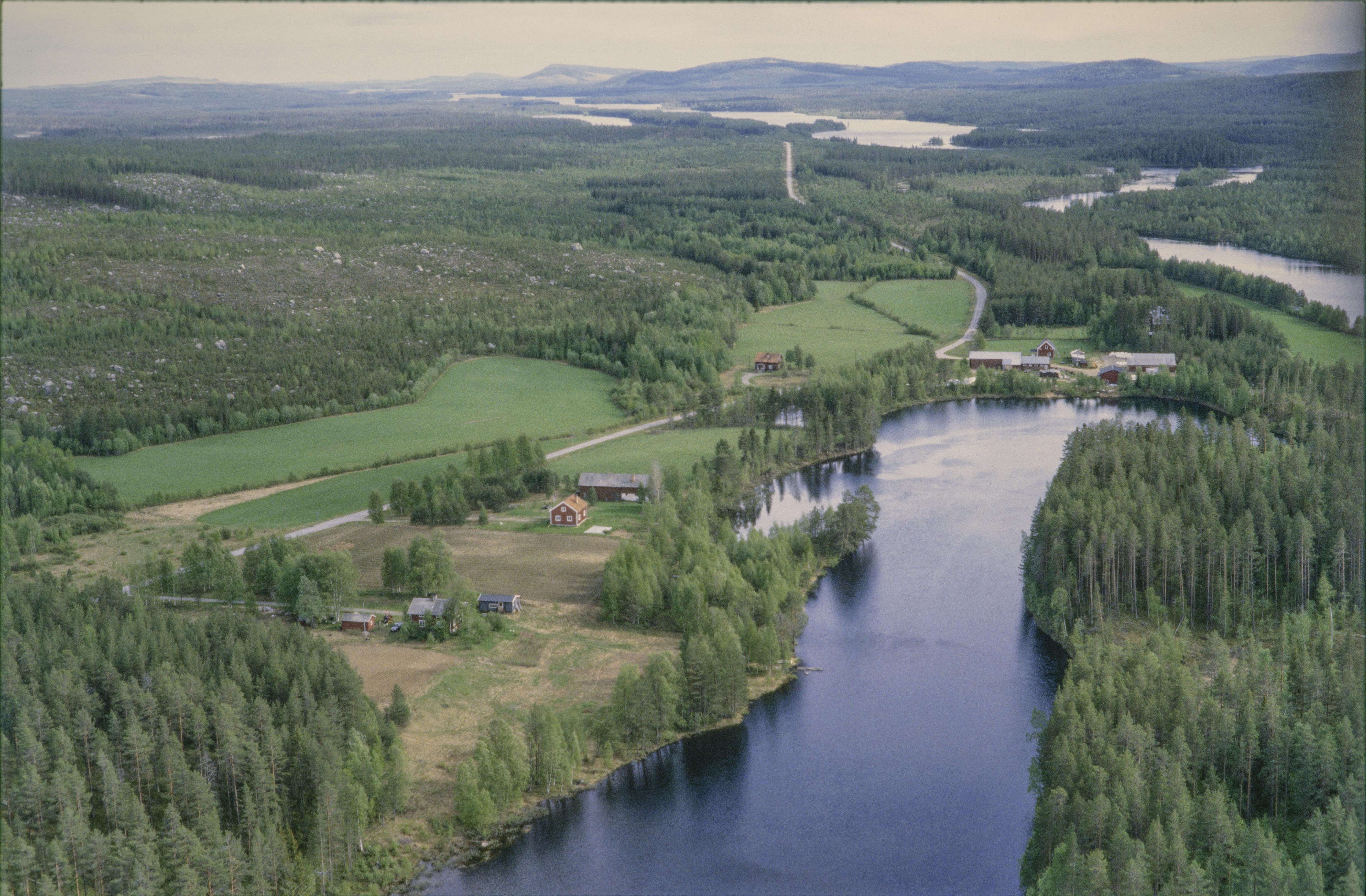 Beskrivning: Område söder om torpet Österås på Juktåns östra strand. Storholmen nere till höger. Längs ån flera torp i Juktåkolonin som är en grupp kronolägenheter / torp i områdena vid Juktån och orten Gunnarn. Över bildens mitt boplats RAÄnr Stensele 1139 m.fl. Bilden är tagen mot (väderstreck): S