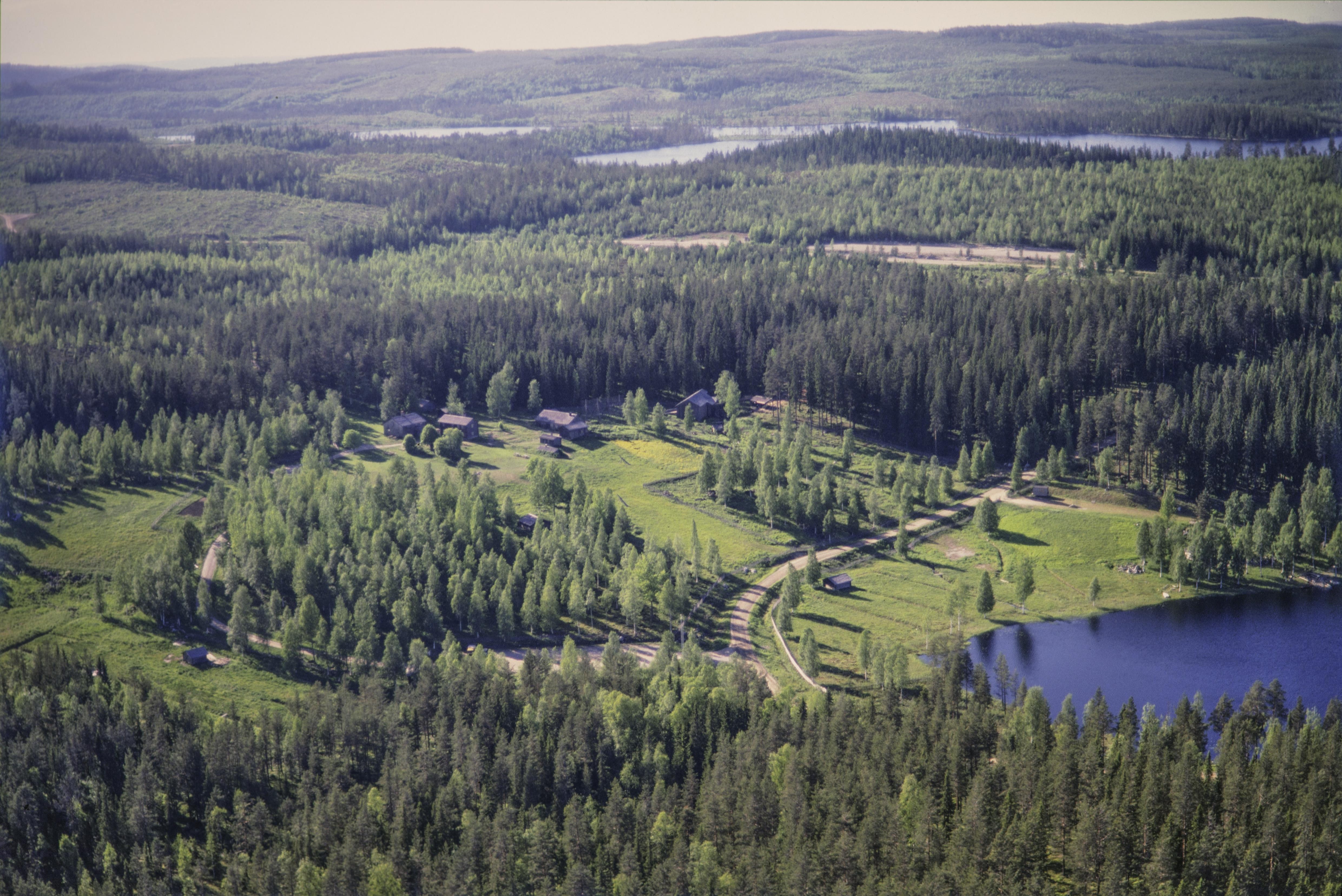 Beskrivning: Väster om sjön Gudmundstjärn (nere till höger). Området i och runt sjön är naturreservat. Skogshemmanet och byggnadsminnet Nybygget med 23 byggnader. I skogen till höger över bildens mitt (i bildens högra kant) Alberttorpet RAÄnr Indal 81:1. Bilden är tagen mot (väderstreck): VNV