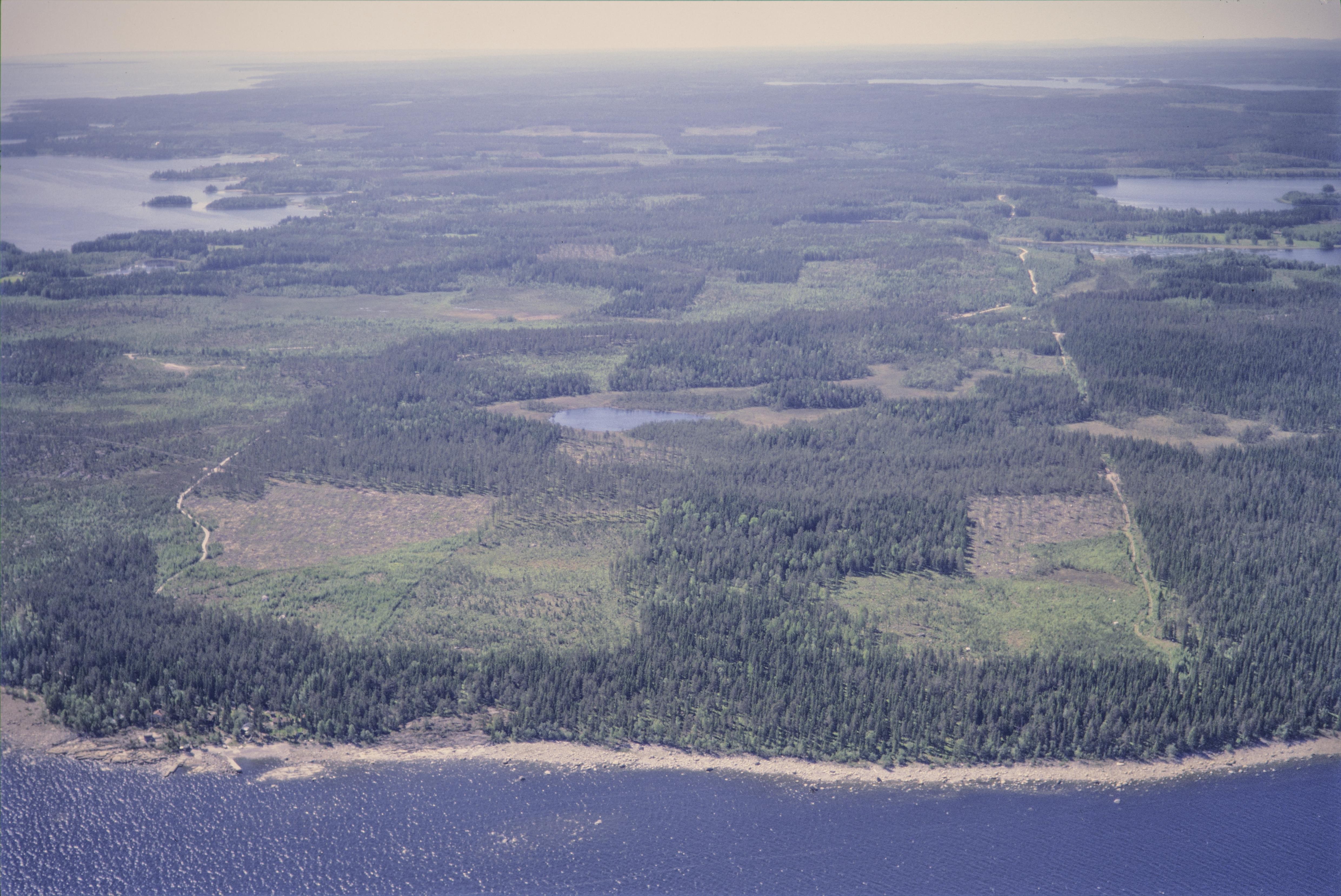 Beskrivning: Björkön, Njurundakusten. I bildens nedre del området mellan Hälludden och Bergaudd. Under bildens mitt till vänster skogbrukslämningar RAÄnr Njurunda 1150 vid Ässjötjärnen. till höger röse RAÄnr Njurunda 482:1. Bilden är tagen mot (väderstreck): SSV