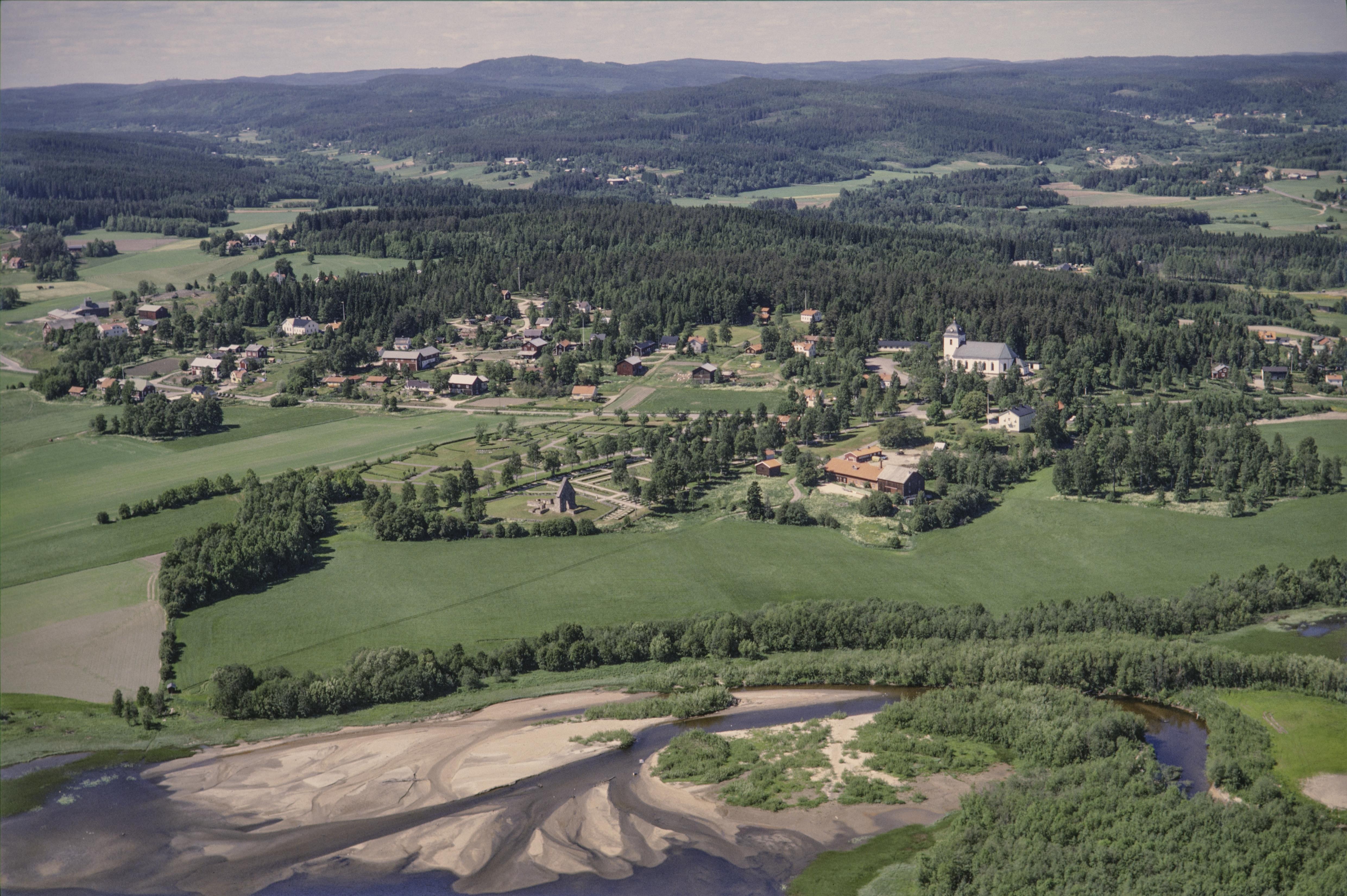 Beskrivning: Selångers kyrkby vid Selångersån, pilgrimleden Sankt Olavsleden och färdväg RAÄnr Selånger 80:1. Selångers kyrka till höger om bildens mitt. Selångers kyrkooruin RAÄnr Selånger 86:1 vid bildens mitt. Bilden är tagen mot (väderstreck): NV